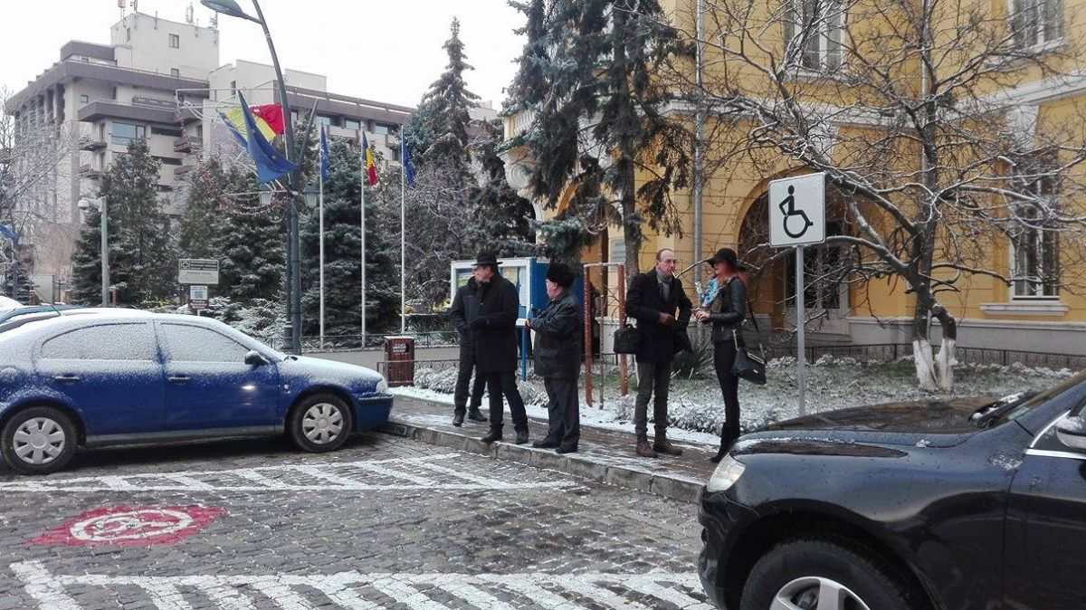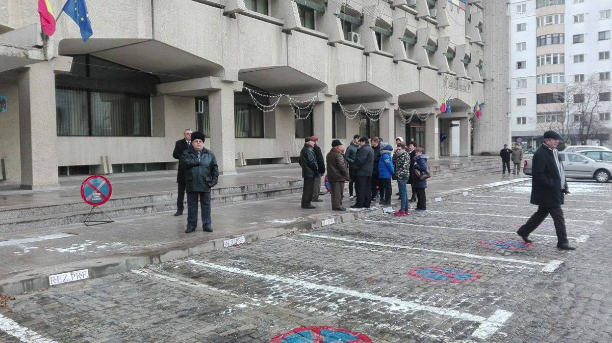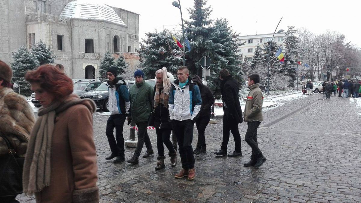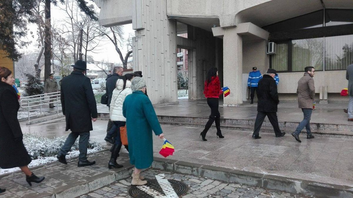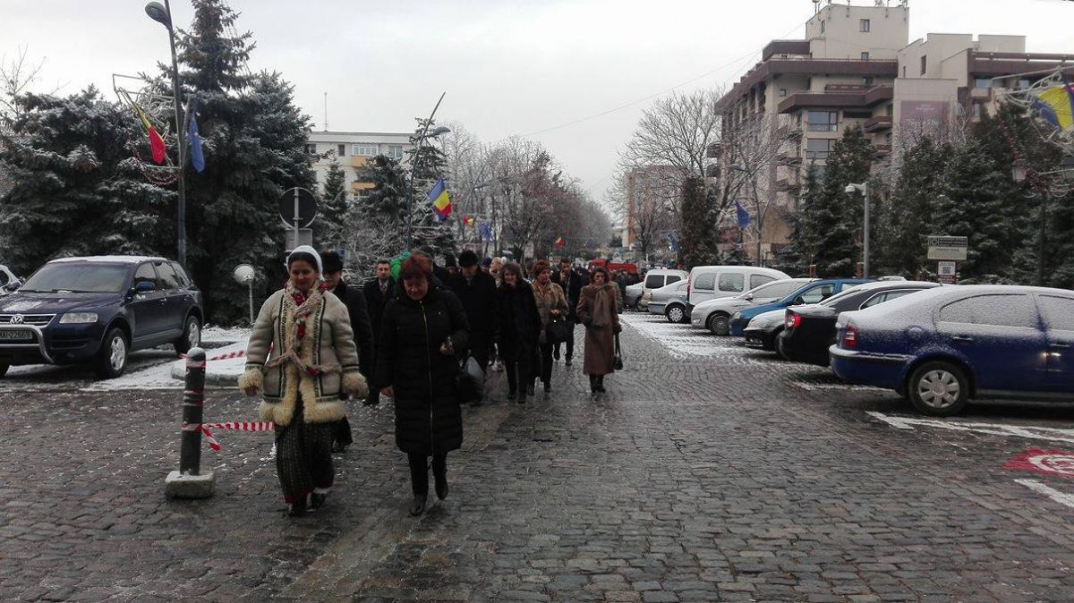 Șefii orașului și județului, directori de deconcentrate, politicieni și copii s-au adunat în Piața Revoluției pentru a porni în coloană oficială către zona istorică a orașului. Multe dintre doamne poartă costum popular, altele sunt îmbrăcate cu paltoane elegante și pe tocuri.
