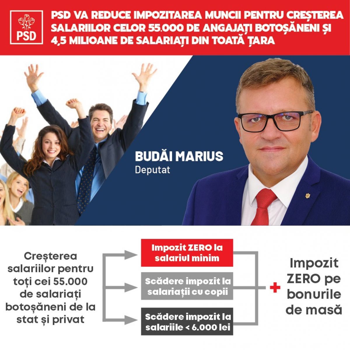 Deputatul social democrat botoșănean, Marius Budăi, candidat pentru un nou mandat de parlamentar a anunțat astăzi că PSD dacă va ajunge la guvernare va implementa un program de fiscalitate pentru scăderea impozitelor pe salariile mai mici de 6.000 lei, până la impozit ZERO pe salariu minim.