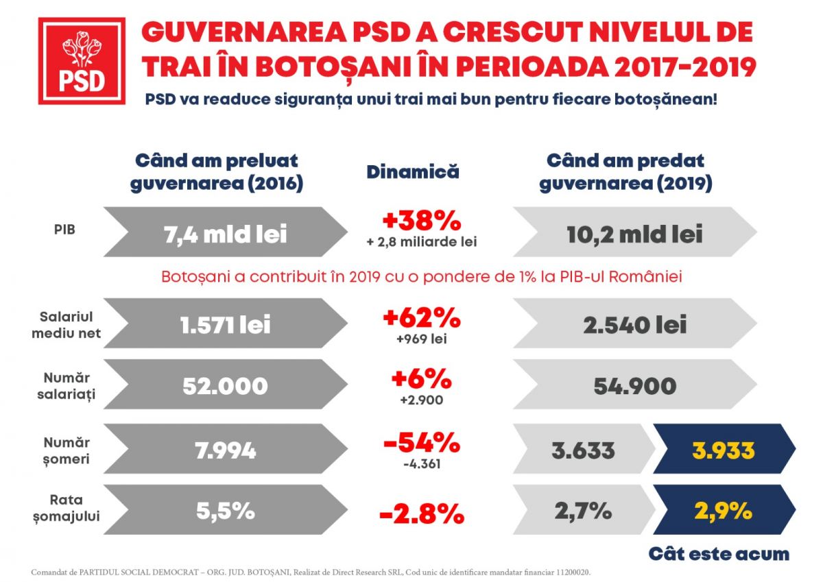 În guvernarea PSD, Produsul Intern Brut a crescut în județul Botoșani cu 38%, respectiv 2,8 miliarde de lei, de la 7,4 miliarde de lei la 10,2 miliarde de lei, cu o pondere de 1% în PIB-ul României.