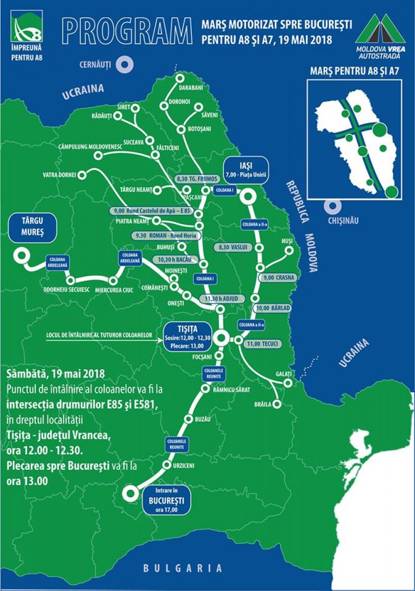 În coloană vor fi şi autovehicule din Mureş - Covasna, cât şi din zona Galaţi - Brăila, ne-a asigurat Cătălin Urtoi, care a precizat că demersul vizează în egală măsură proiectul autostrăzii A7, cea care va lega nordul Moldovei de Bucureşti. „A7 şi A8 sunt primele autostrăzi care trebuie făcute în Moldova. Trebuie să ne unim pentru aceste două proiecte“, a mai spus Urtoi, citat de Ziarul de Iași.