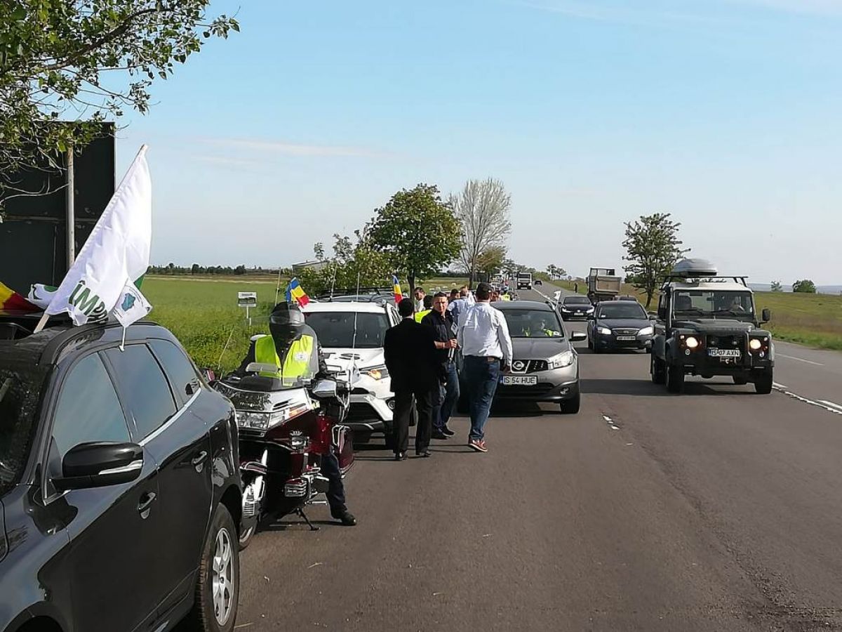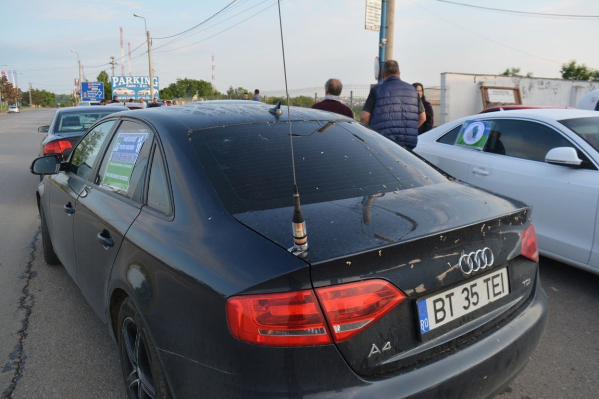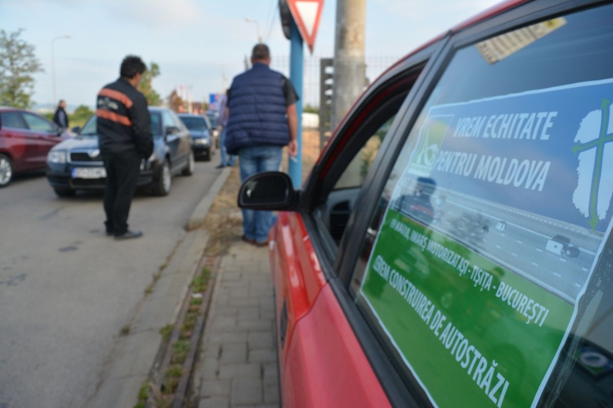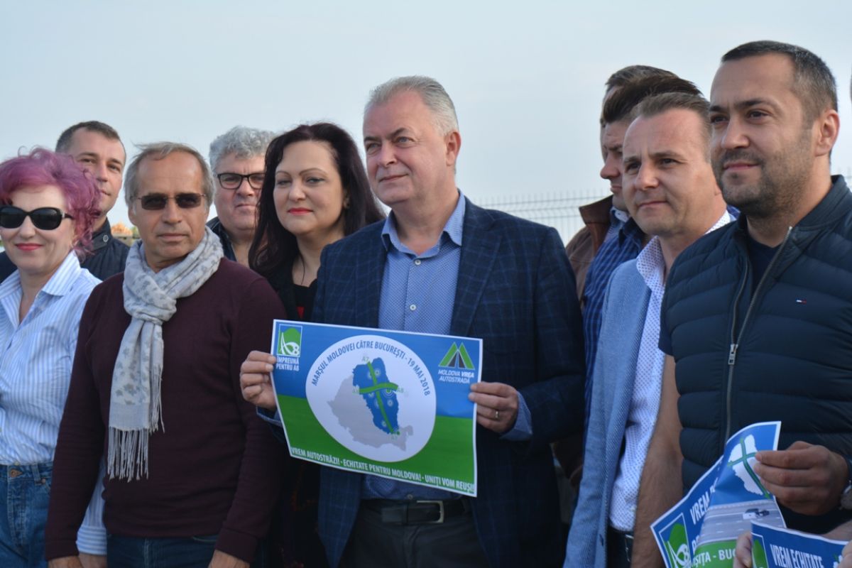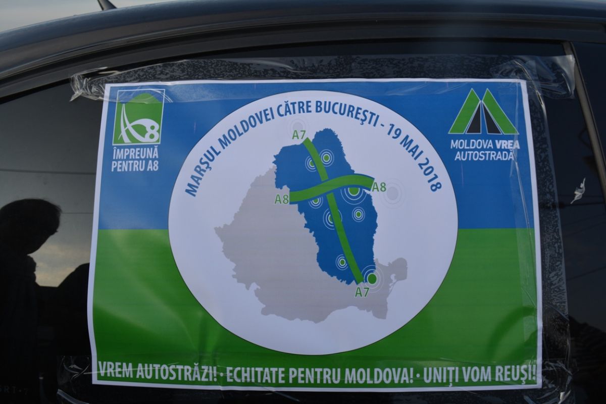 Primarul Cătălin Flutur, senatorul Costel Șoptică, ex-parlamentaii Viorel Grigoraș și Cristian Roman, consilieri județeni și locali tocmai își lipeau pe automobile afișe pe care scria: ”Marșul Moldovei către București - 19 mai 2018” și ”Vrem autostrăzi - Echitate pentru Moldova - Împreună vom reuși”.