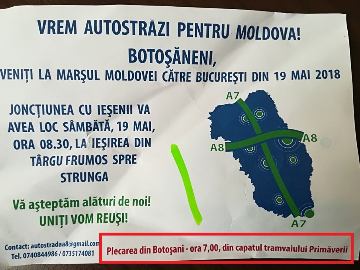 Reprezentanții acestora au făcut pe 21 aprilie propagandă acțiunii inclusiv la Botoșani, când au împărțit fluturașe pe care se menționa: ”plecarea din Botoșani, ora 7:00, din capătul tramvaiului Primăverii”.