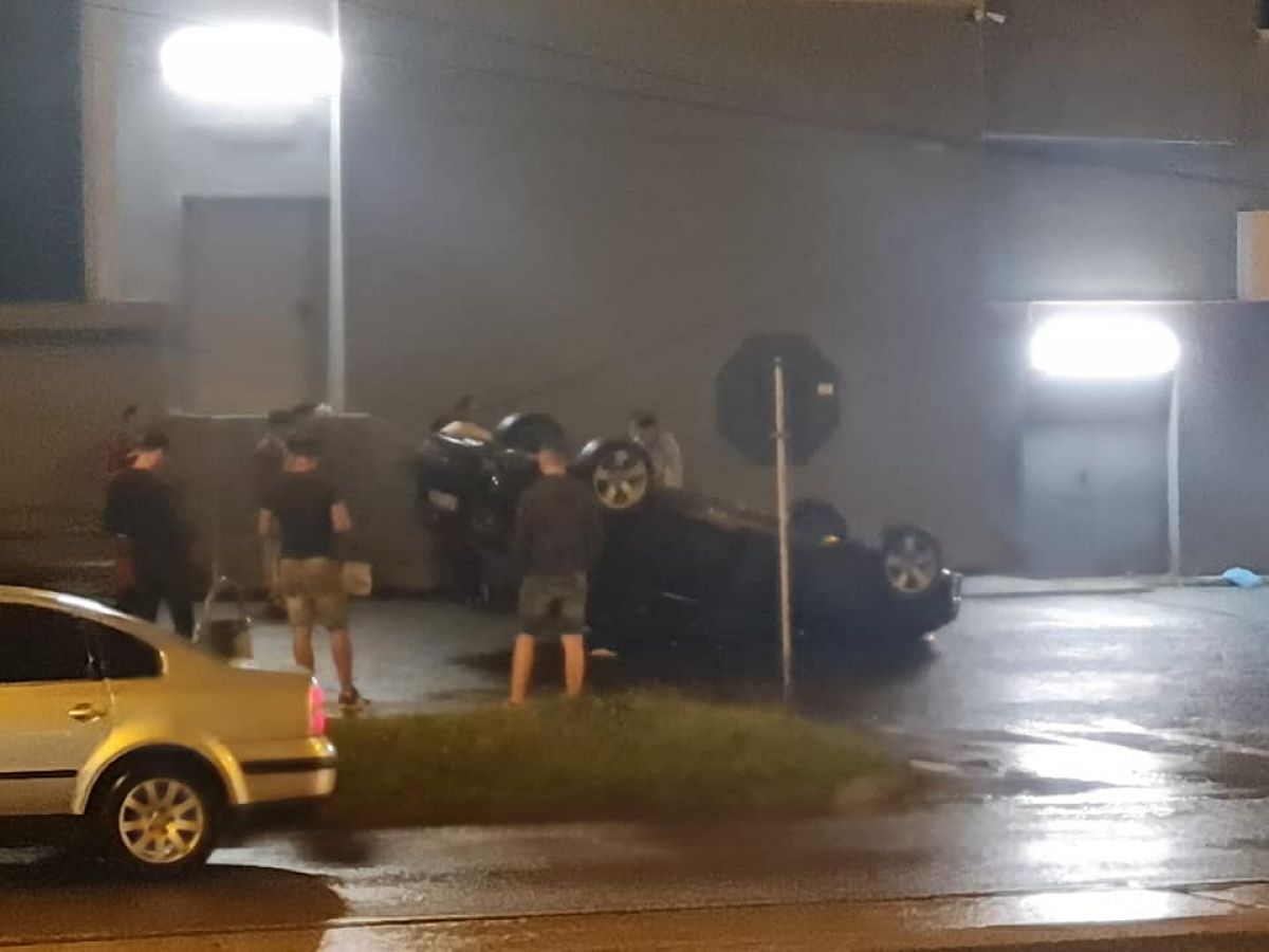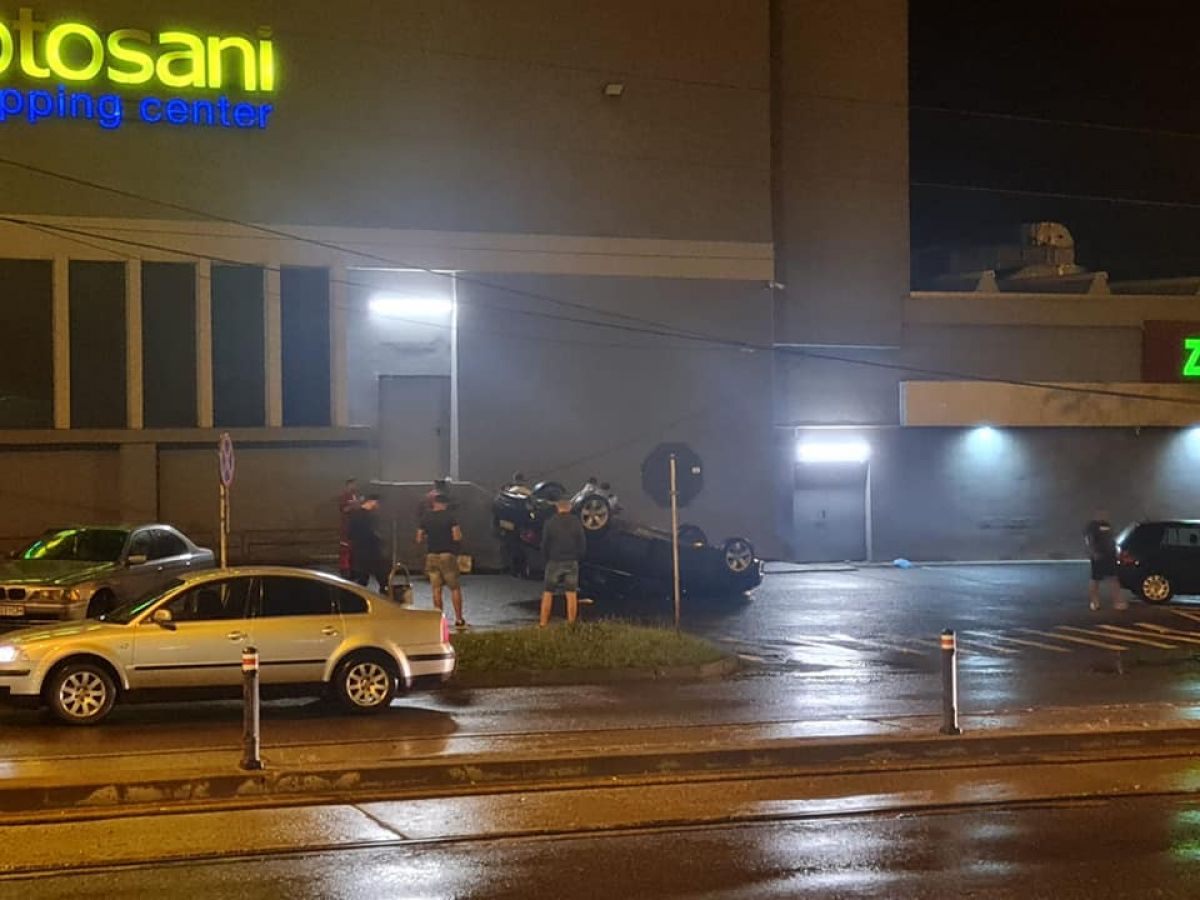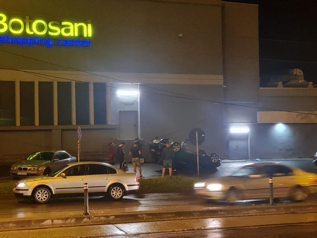 Evenimentul rutier s-a produs miercuri noaptea, pe strada Sucevei, mașina fiind răsturnată pe cupolă, într-o parcare.