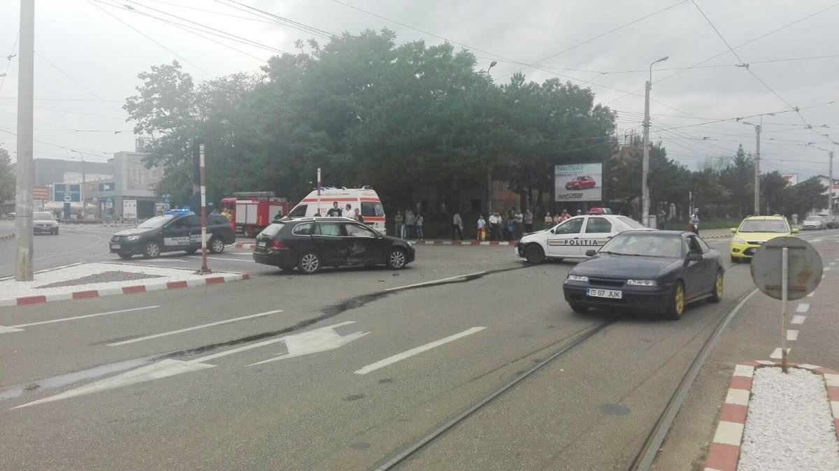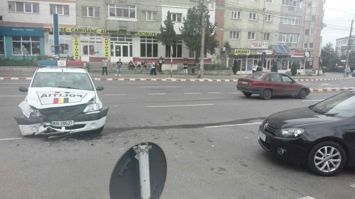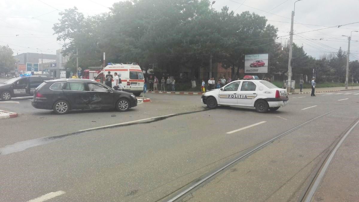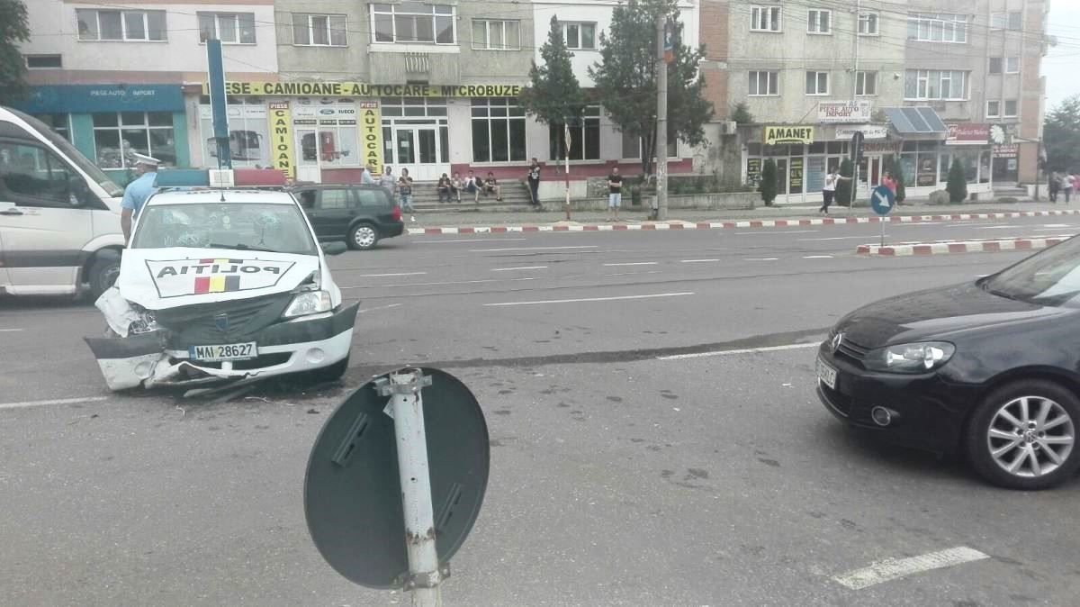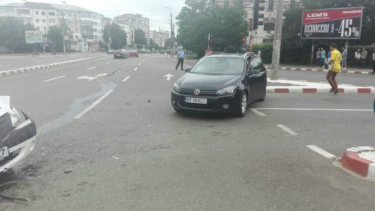 Accident rutier duminică după-amiază pe cea mai circulată arteră a municipiului Botoșani! O autospecială a Poliției și un VW Golf s-au izbit pe Calea Națională.