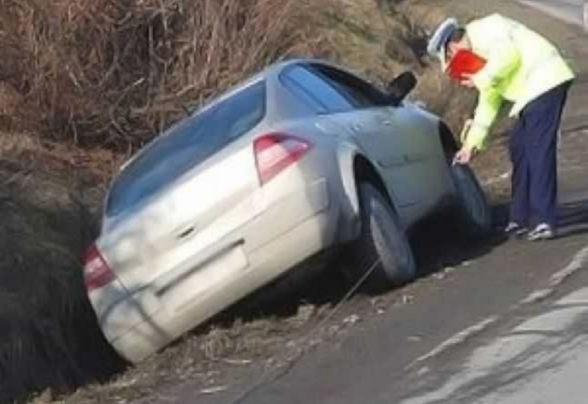 Autospeciala de poliție se deplasa pe DJ 282 când oamenii legii au observat o mașină în șanțul de pe marginea drumului.