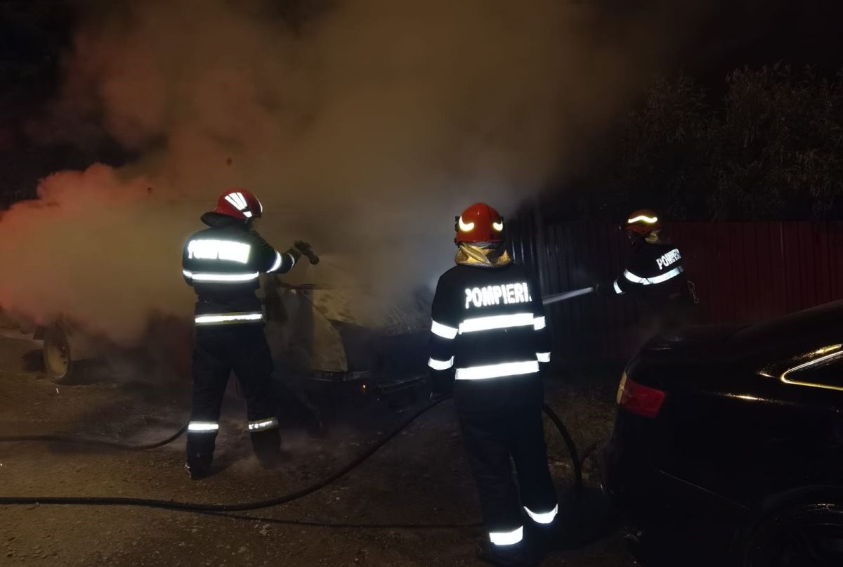 O autoutilitară parcată pe o stradă din municipiul Botoșani a fost distrusă de flăcări, în noaptea de marți spre miercuri.