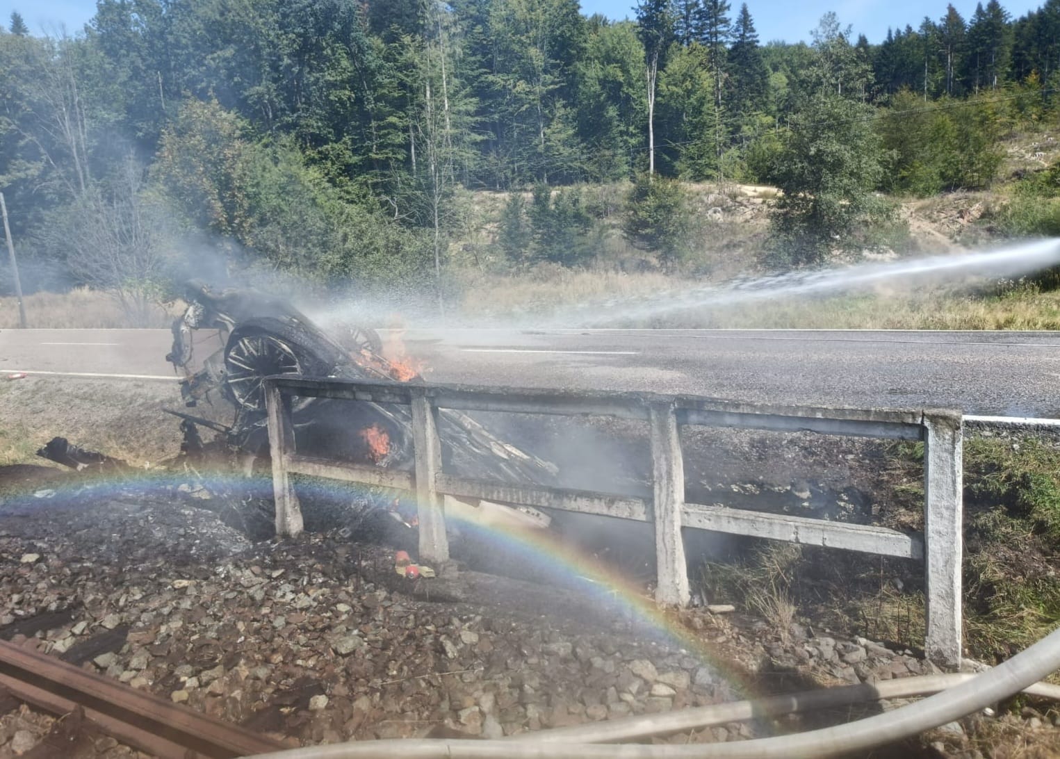 În urma coliziunii de pe raza localității Păltinoasa, una dintre mașini s-a răsturnat în afara părții carosabile și a luat foc.
