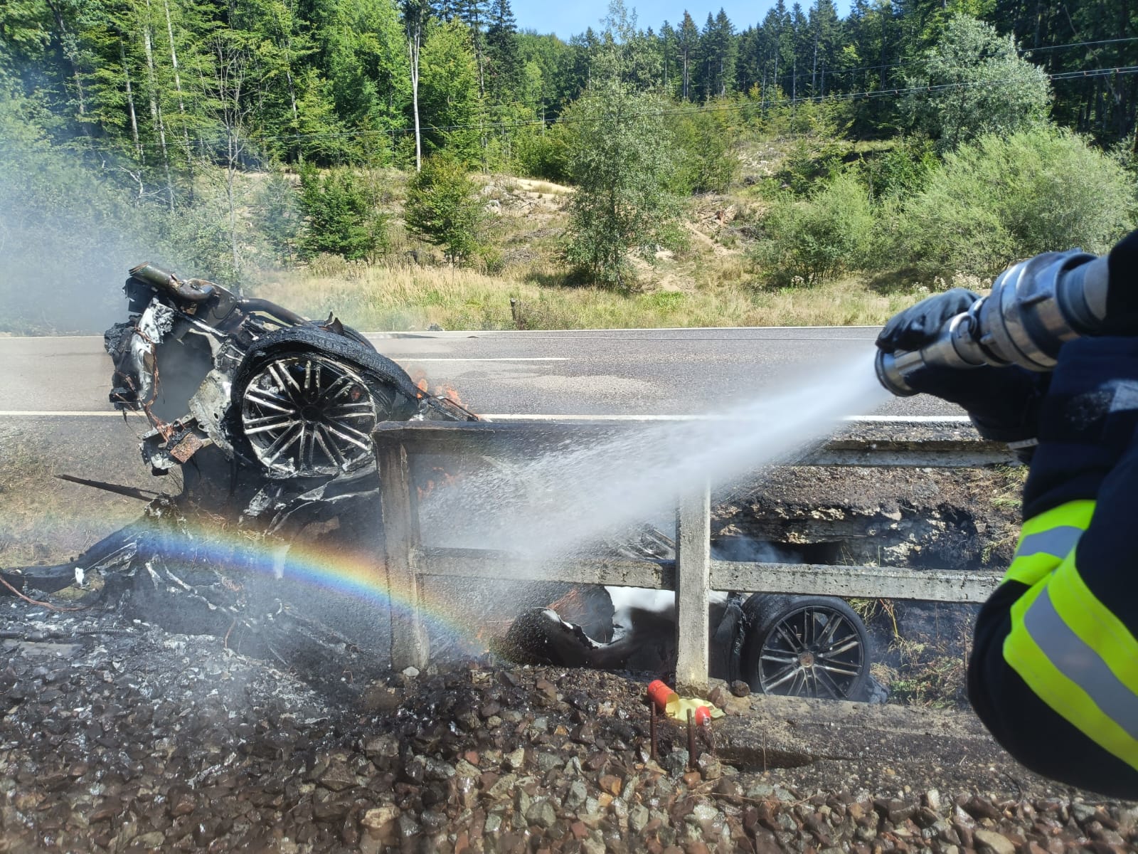 În momentul de față, se lucrează pentru lichidarea incendiului care a cuprins întregul autovehicul.