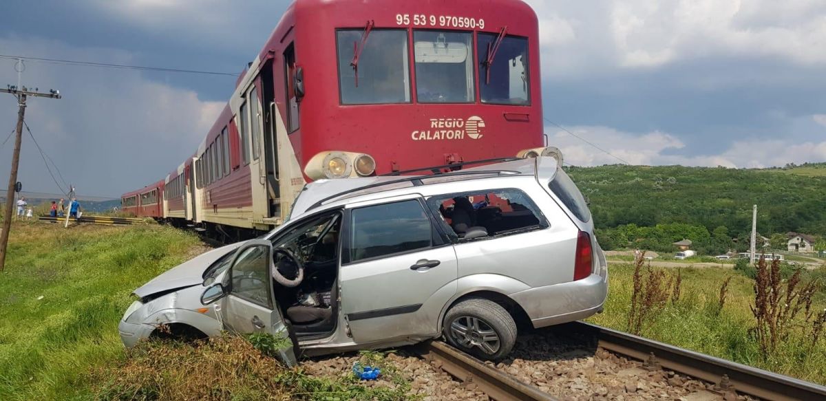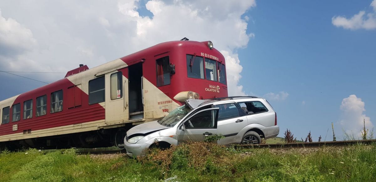 Un autoturism Ford, în care se aflau două persoane, a fost acroșat de un tren.