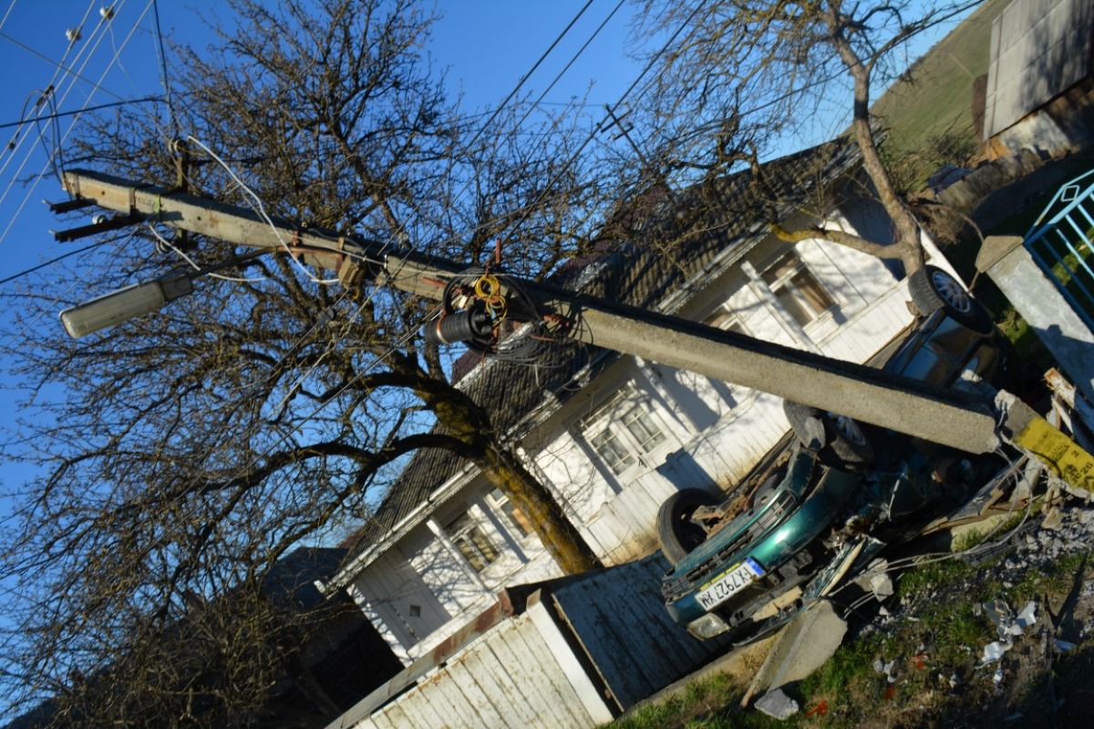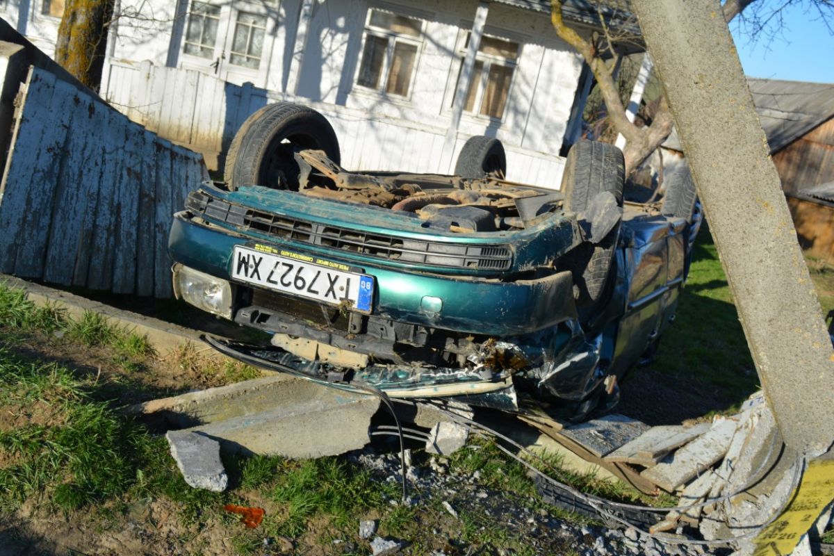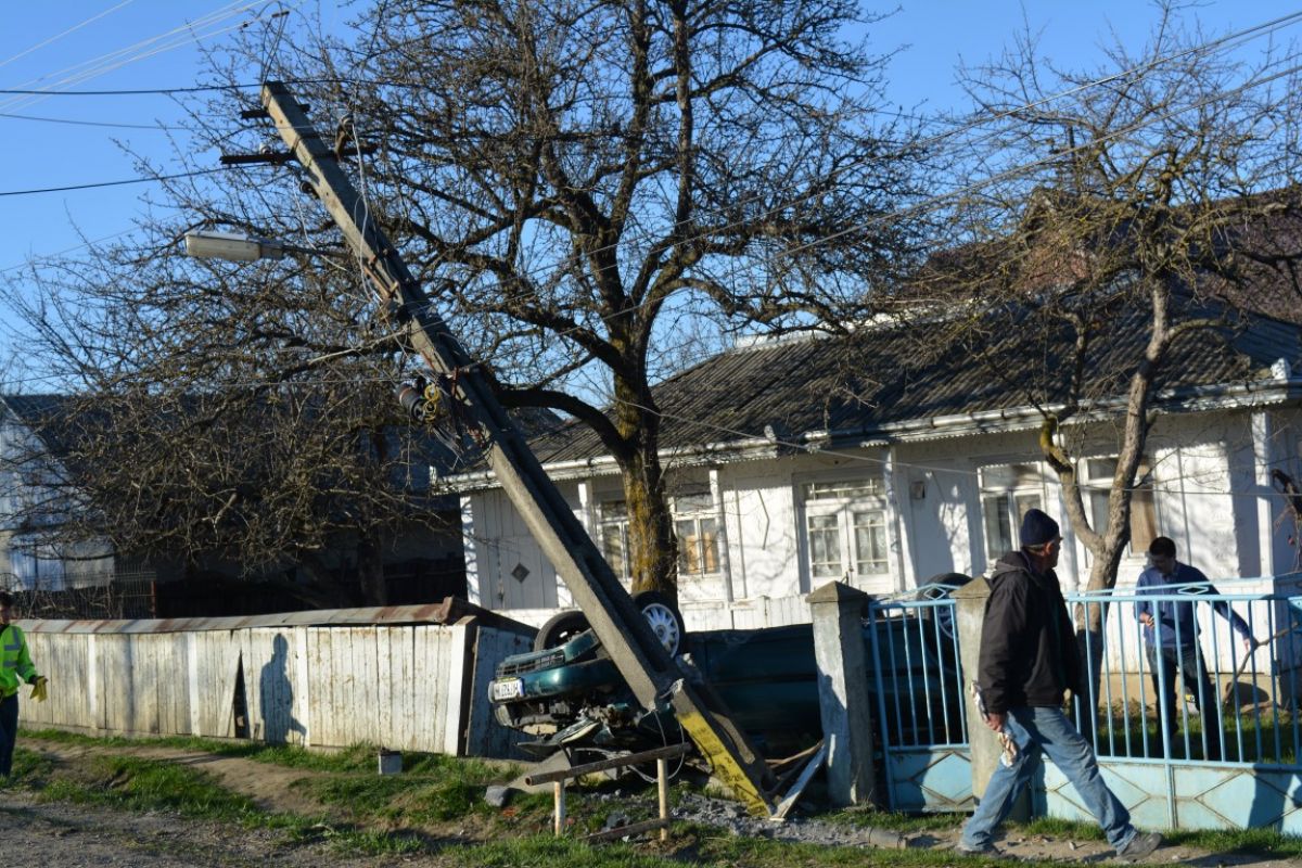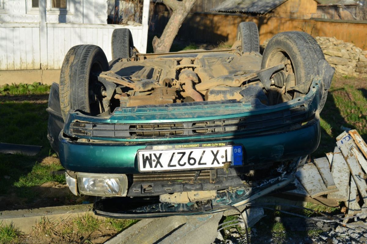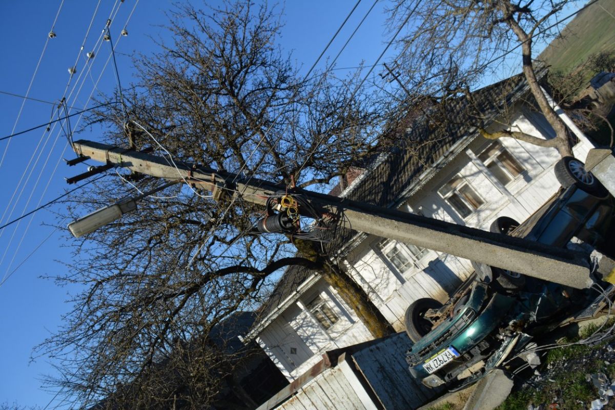 Mașină răsturnată, stâlp rupt de-un șofer de 28 de ani, doi oameni răniți grav – GALERIE FOTO