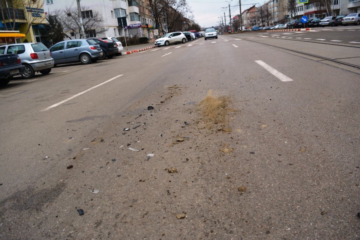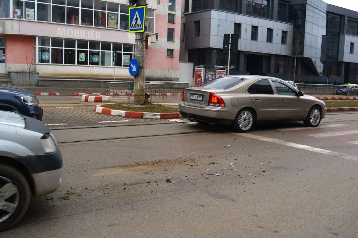 Ambele se deplasau dinspre Uvertura Mall spre gară, iar la zebra de la agenţia Băncii Transilvania, şoferul unui VW Golf a frânat pentru a da prioritate unui pieton. Probabil din cauza distanţei mici pe care o avea faţă de Volkswagen, un Peugeot 207 nu a oprit la timp şi l-a lovit. Pe bancheta din spate a Golf-ului se afla o persoană care a necesitat îngrijiri medicale, fiind transportată cu o ambulanţă la Unitatea de Primiri Urgenţe. Peugeot-ul, serios avariat în partea din faţă, a fost ridicat pe o platformă de la SOS Savencu, în timp ce Golf-ul, însoţit de o maşină a Poliţiei, a plecat spre sediul Serviciului Poliţiei Rutiere din zona industrială. (S.B.)