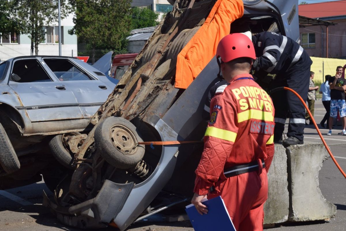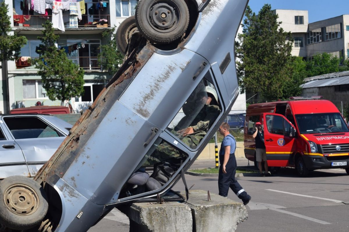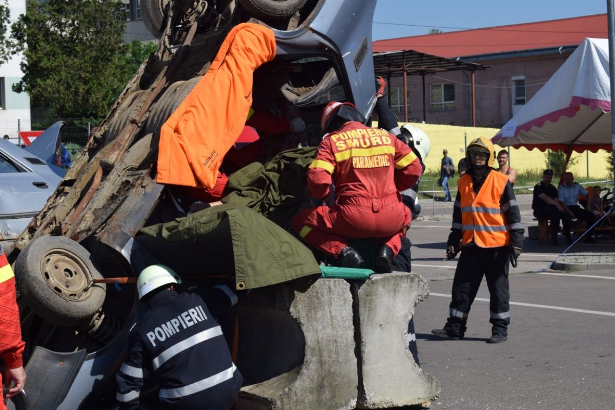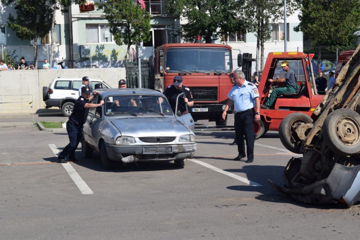 În interiorul mașinii se afla și o ”victimă” aflată în stare de inconștiență care a primit ajutor medical de la echipajele de pe ambulanța SMURD.