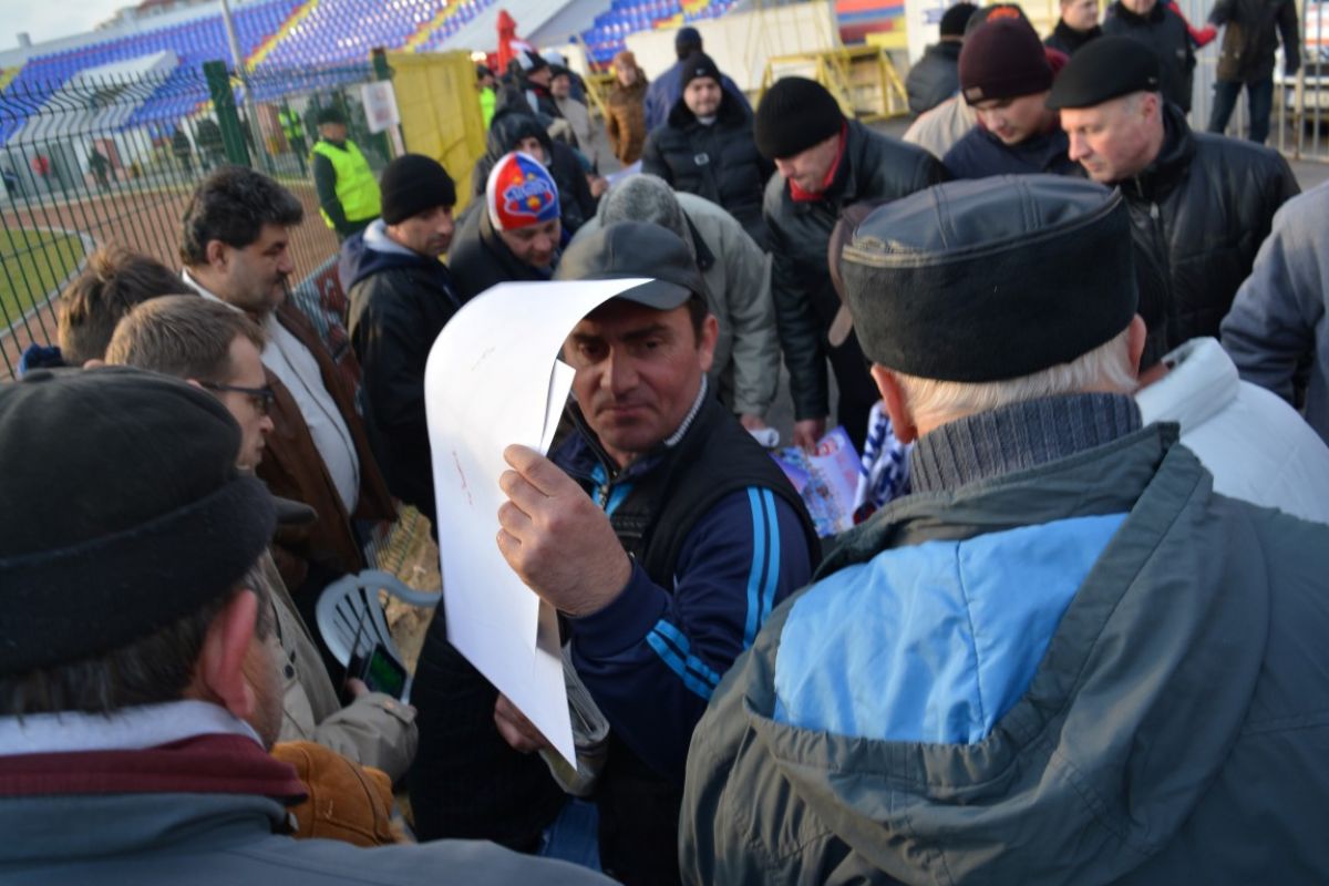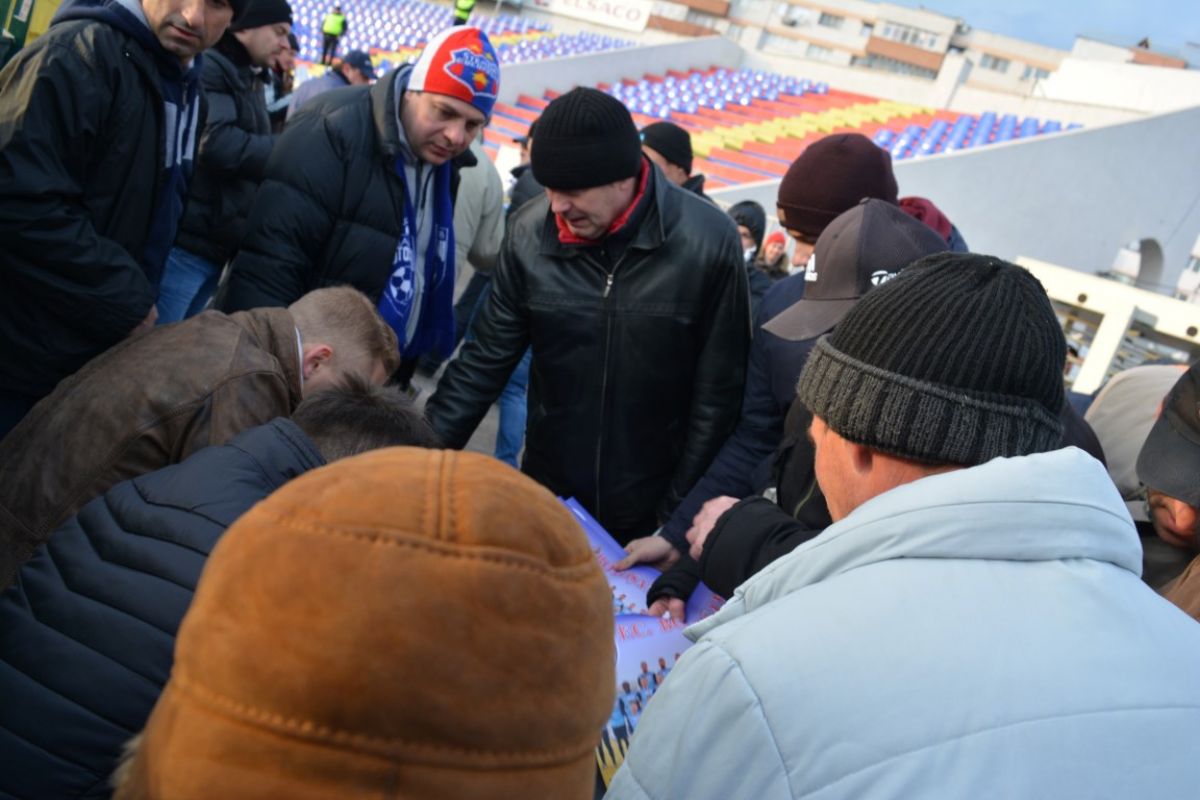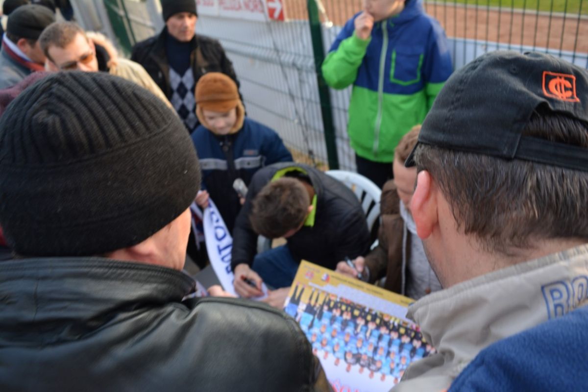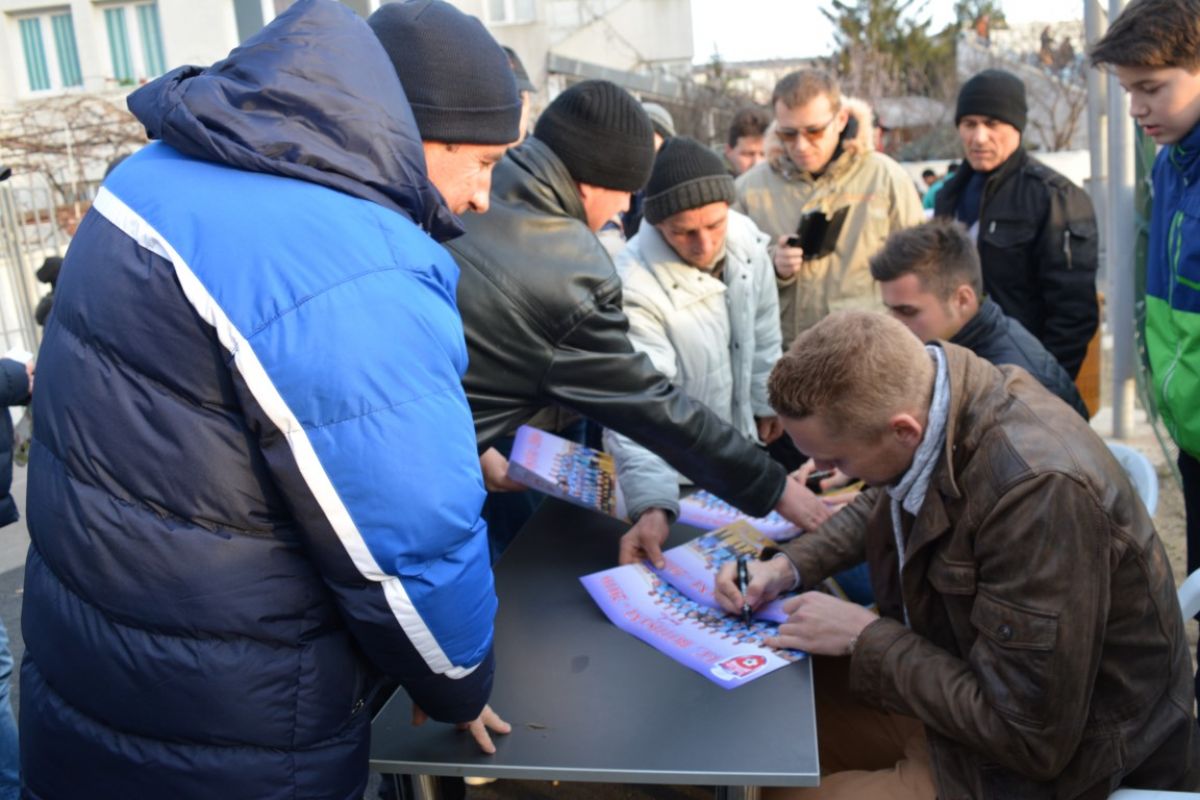 Iniţiativă inedită a clubului gazdă înainte de desfăşurarea meciurilor din play-out. Doi jucători au dat minute bune autografe la intrarea principală a Stadionului Municipal.