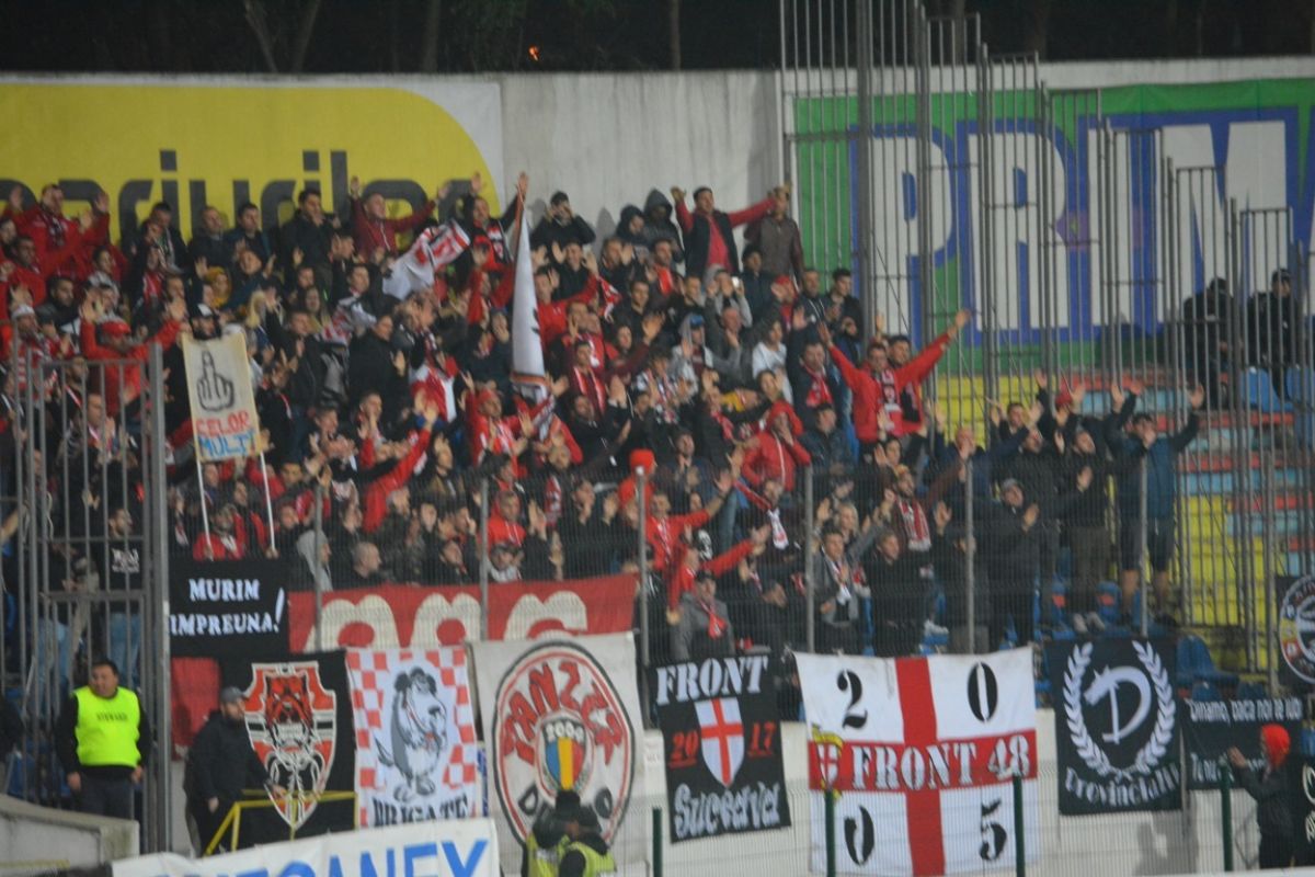”Dinamo, luptă Dinamo”, este scandarea preferată a bucureștenilor, în timp ce micuța galerie botoșăneană, dotată însă cu un ansamblu de tobe ca de concert, a răspuns cu… ”Dinamo, m… Dinamo”.