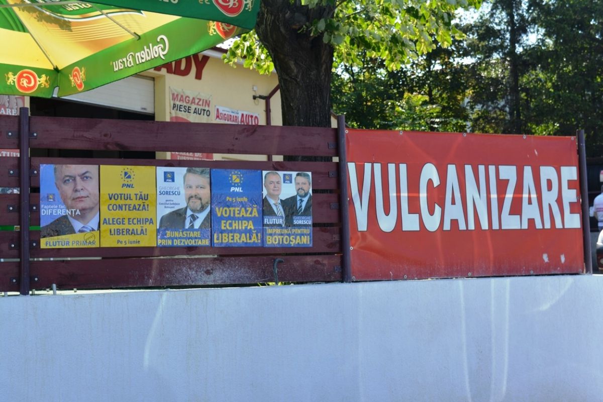 De cealaltă parte a șoselei, la o vulcanizare, erau lipite mai multe afișe ale liberalilor. (S.B.)