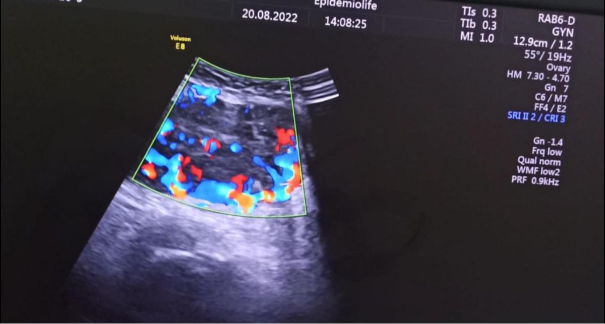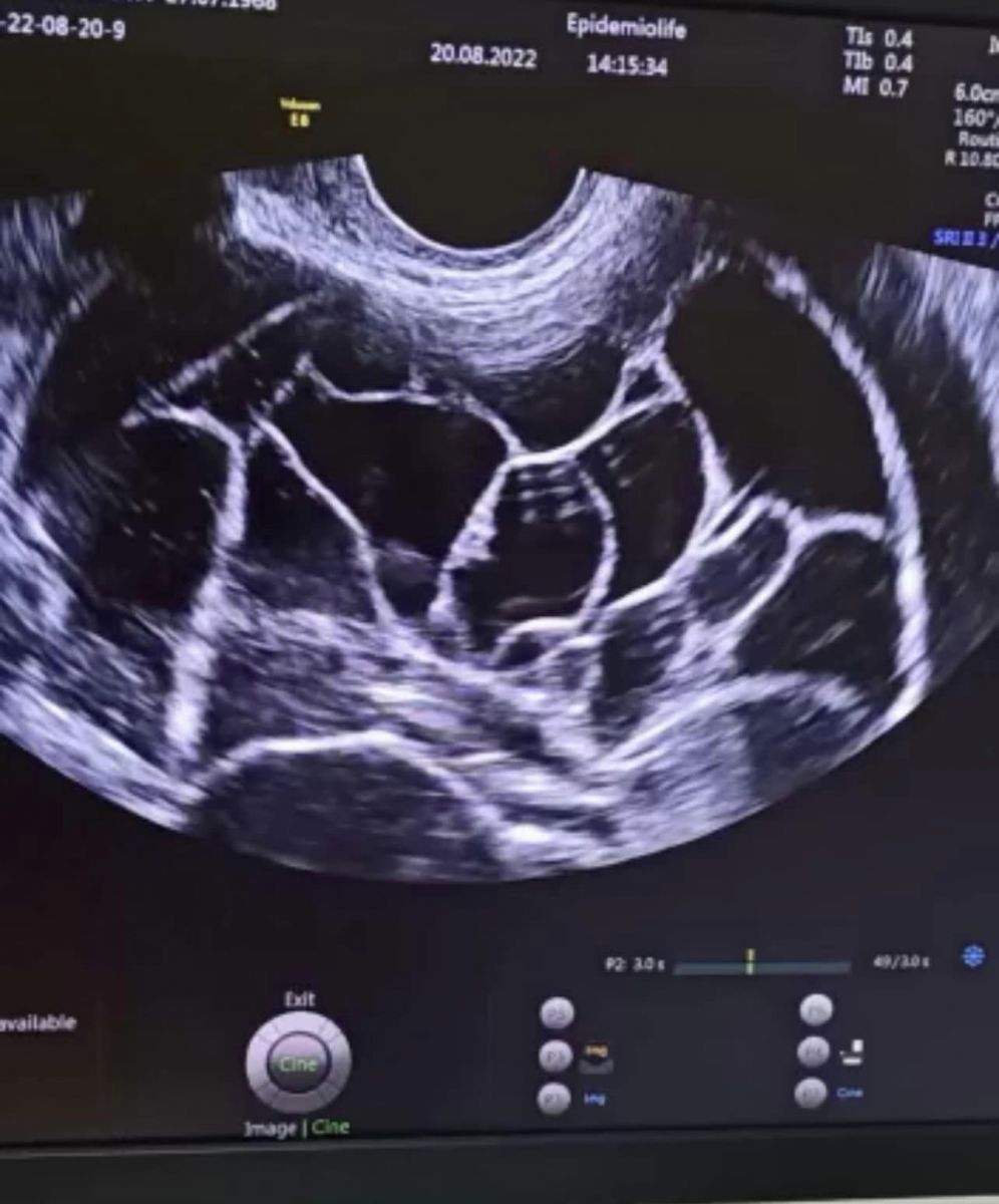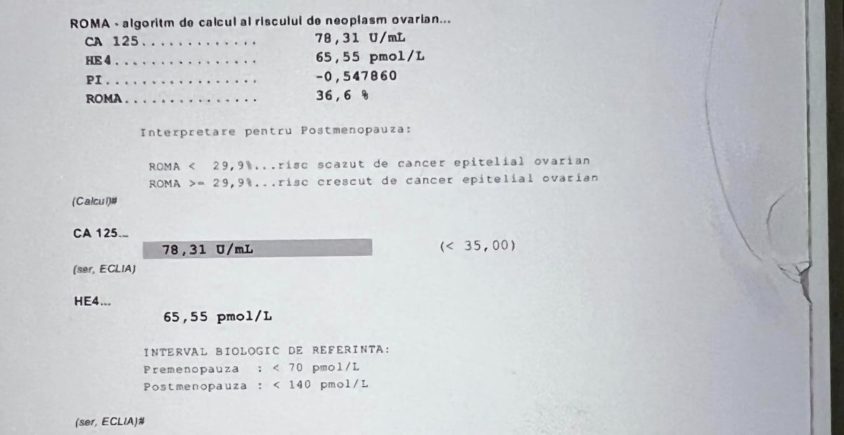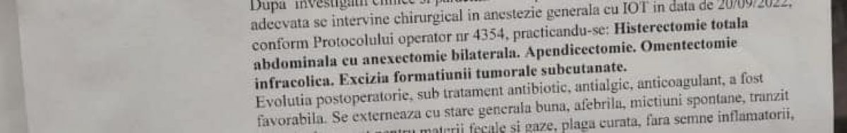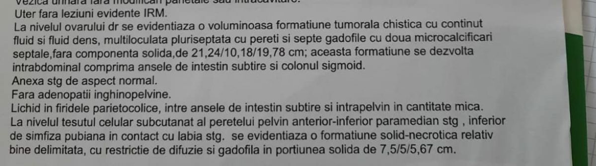 ”Ecografic am depistat o formațiune chistica cu multe septuri la nivelul ovarului drept, de aproximativ 20 cm, cu prezență de lichid liber în burtă și o altă formațiune cu caracter solid și vascularizație intensă localizată subcutanat la nivel suprapubian, de aproximativ 7 cm”,