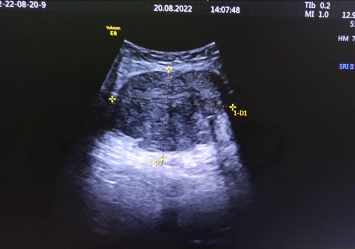 Pacienta are 54 ani și nu a declarat afecțiuni medicale în istoric. Inspecția și palparea abdominală au evidențiat o formațiune solidă, localizată suprapubian, care deforma pielea, de dimensiunea unui pumn, și durea la atingere și mărirea de volum a abdomenului în totalitate, până deasupra ombilicului, de consistență dură și sensibil la palpare.