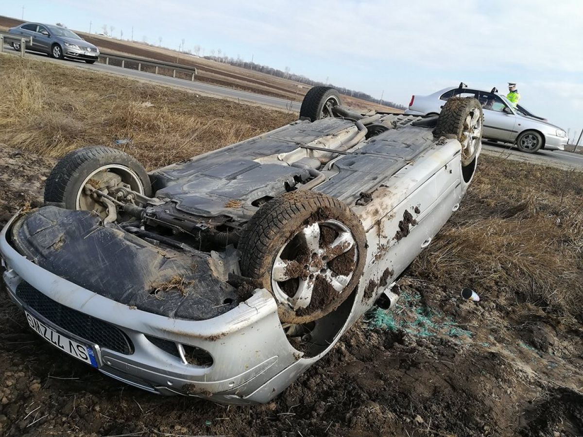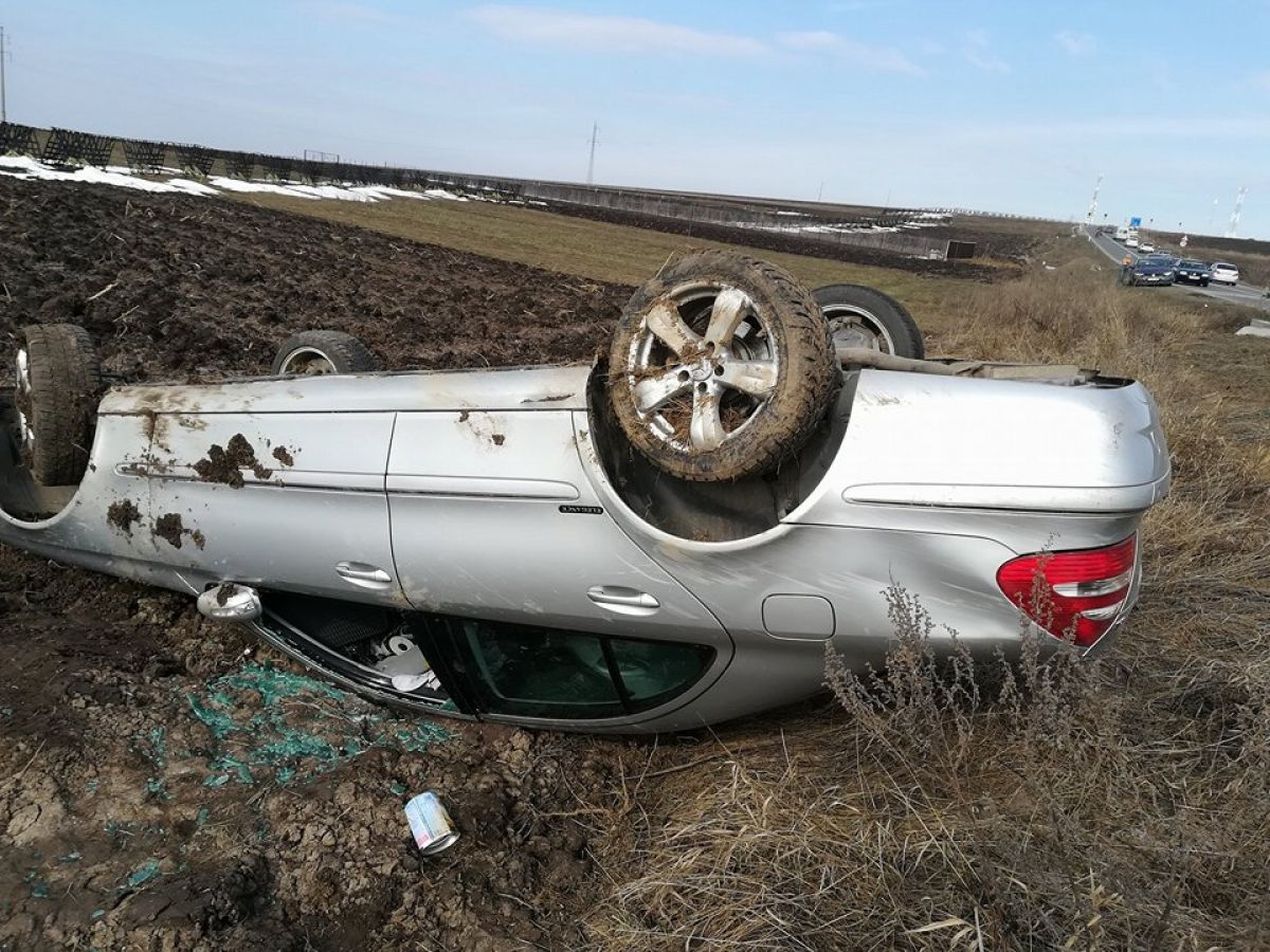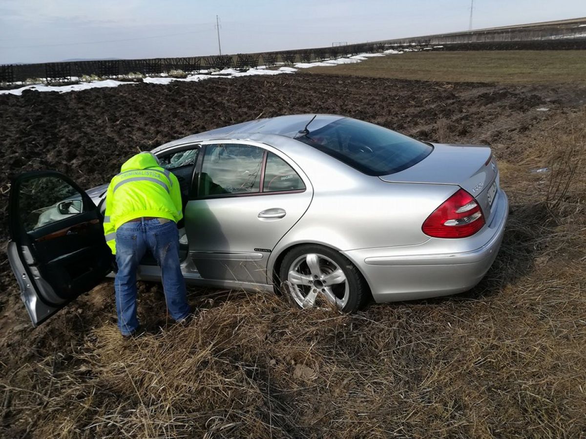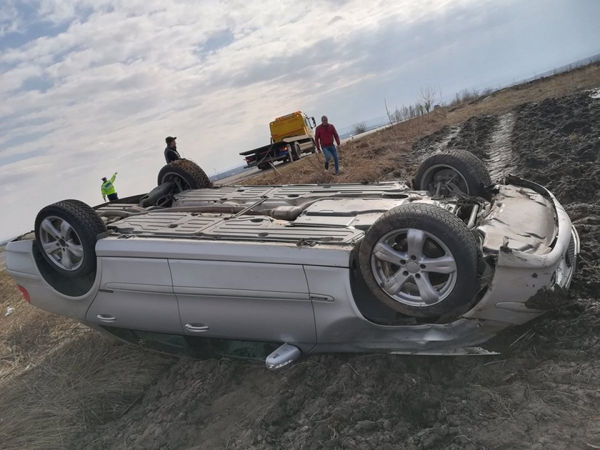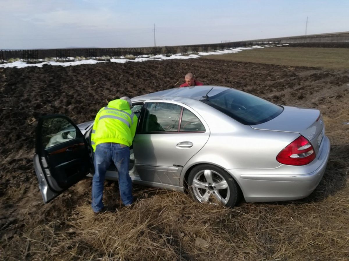 Un Mercedes în care se aflau cinci persoane a ieşit de pe carosabil şi s-a răsturnat pe câmp, la câţiva metri de şosea.