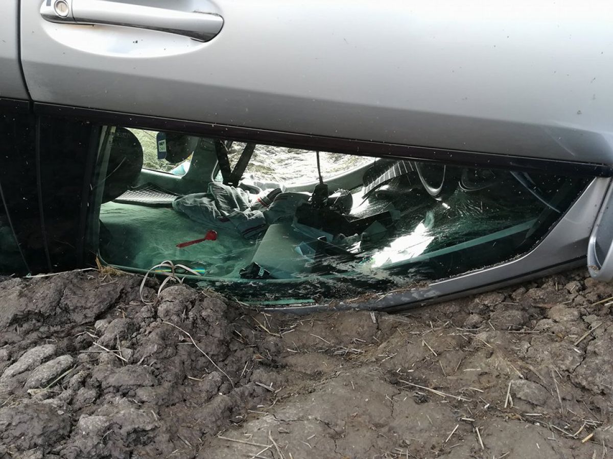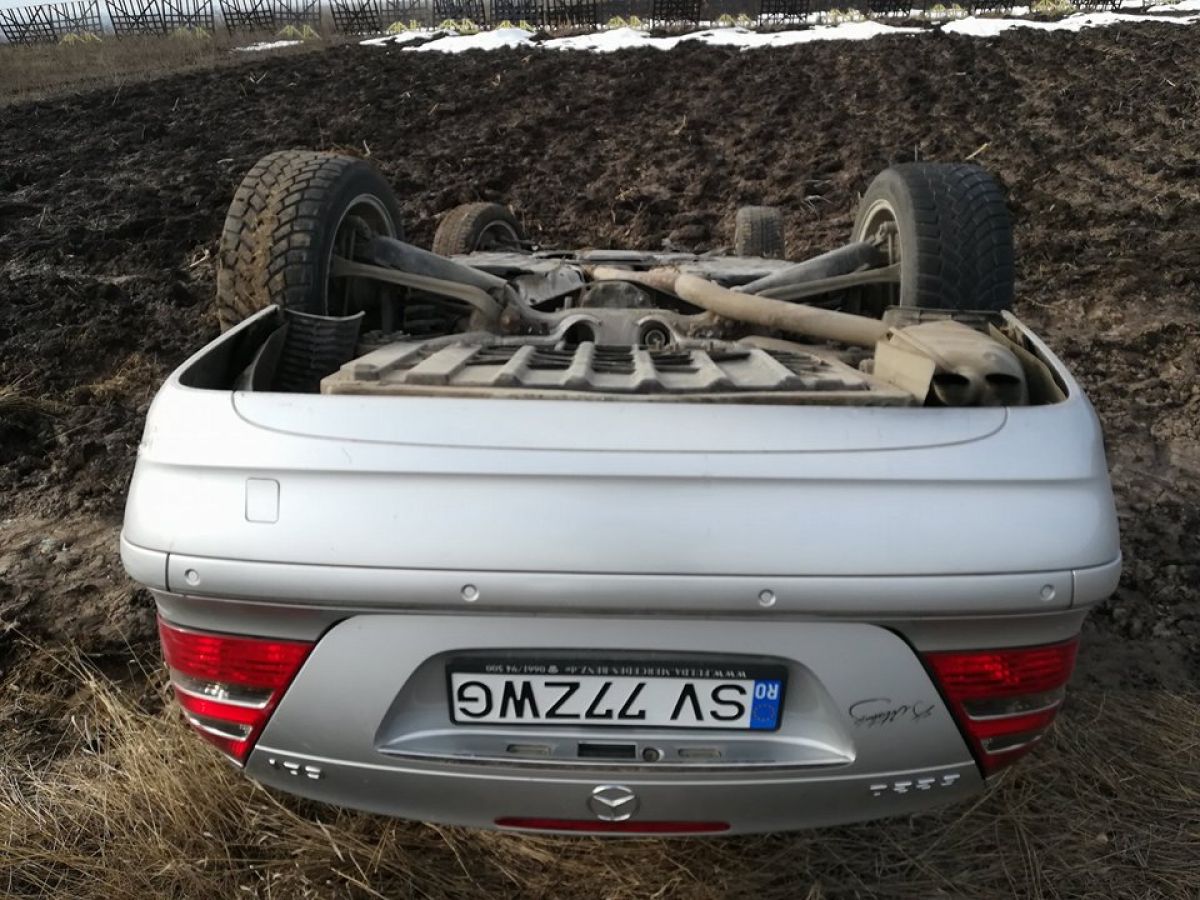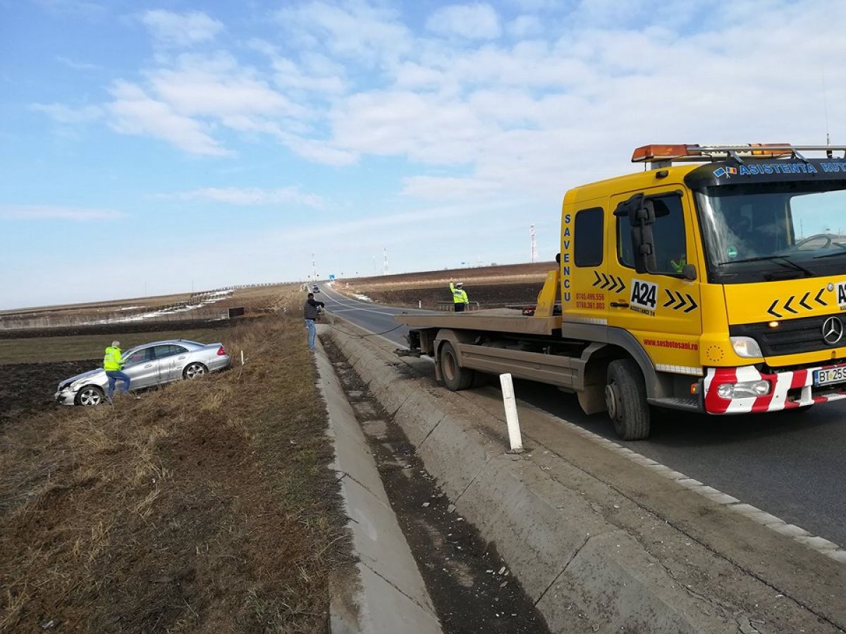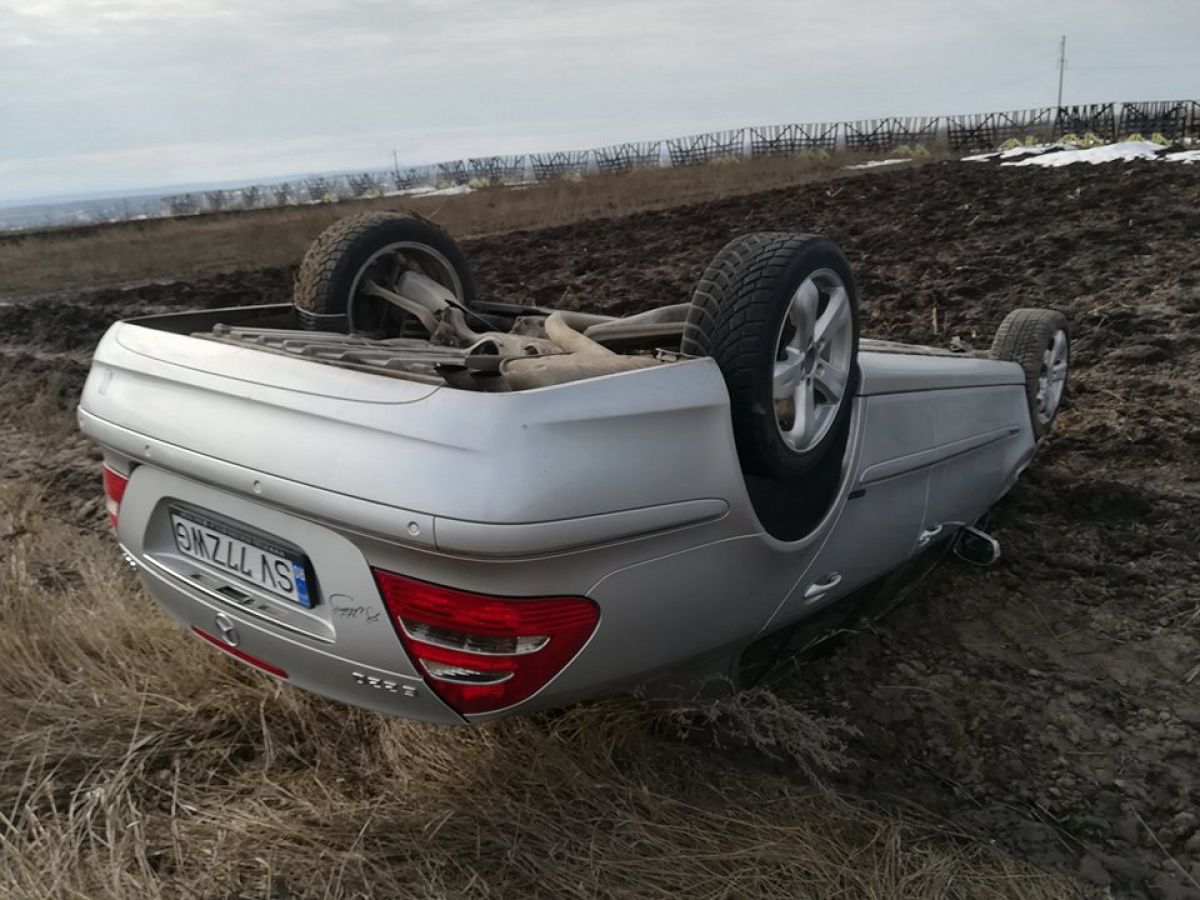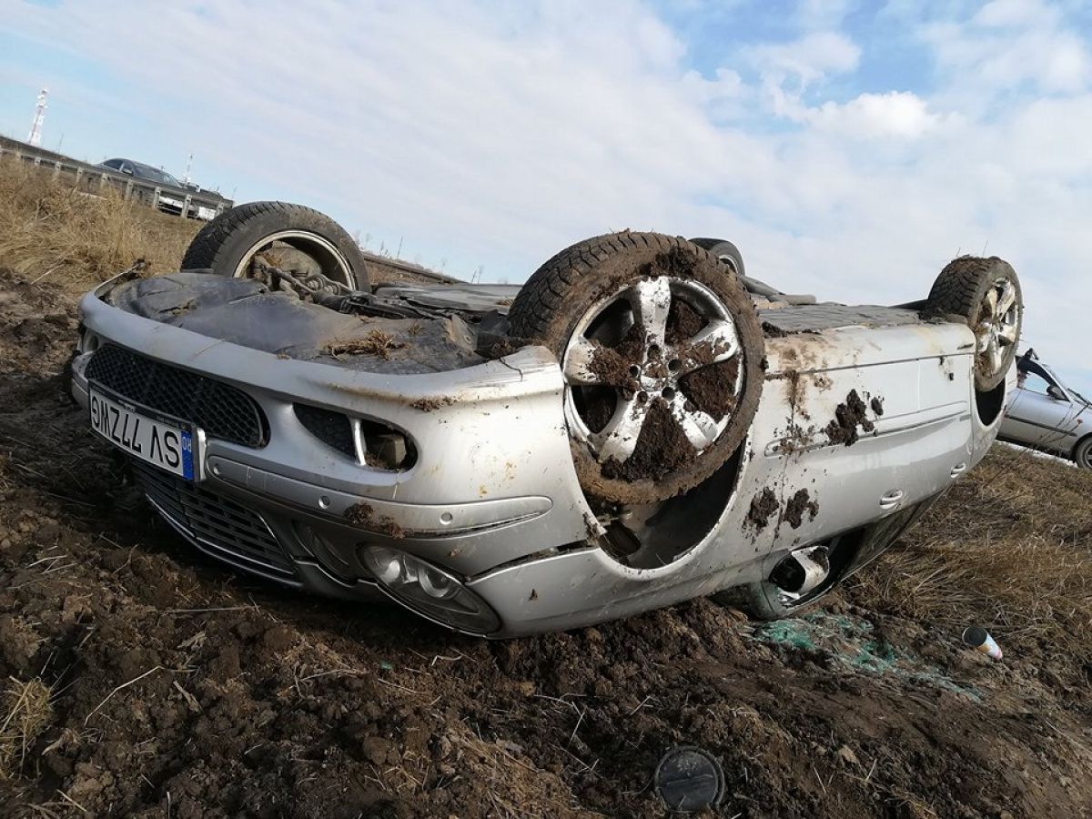 Un Mercedes în care se aflau cinci persoane a ieşit de pe carosabil şi s-a răsturnat pe câmp, la câţiva metri de şosea.