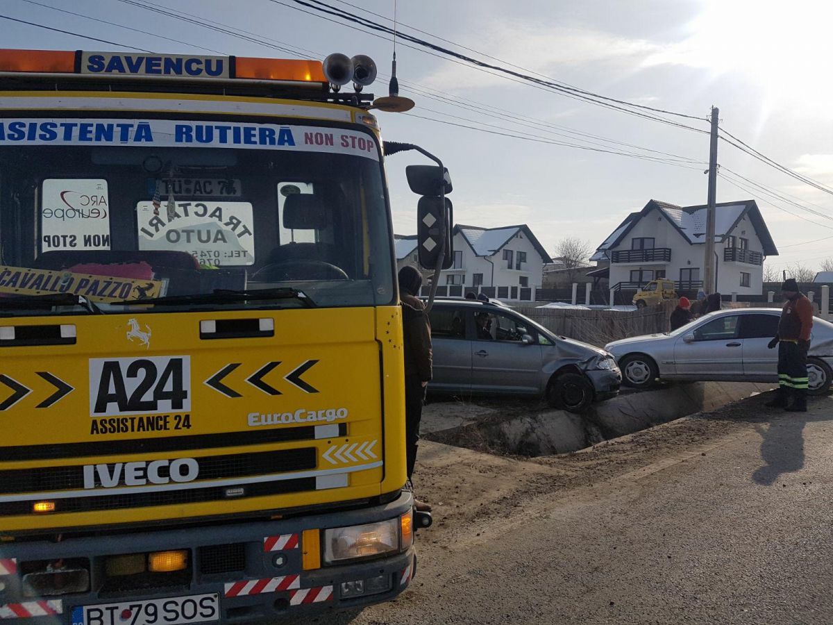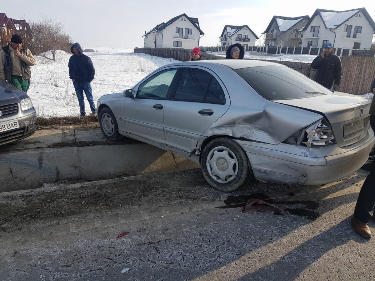 Impactul a fost în laterala Mercedesului, ambele autoturisme fiind proiectate în șanț.