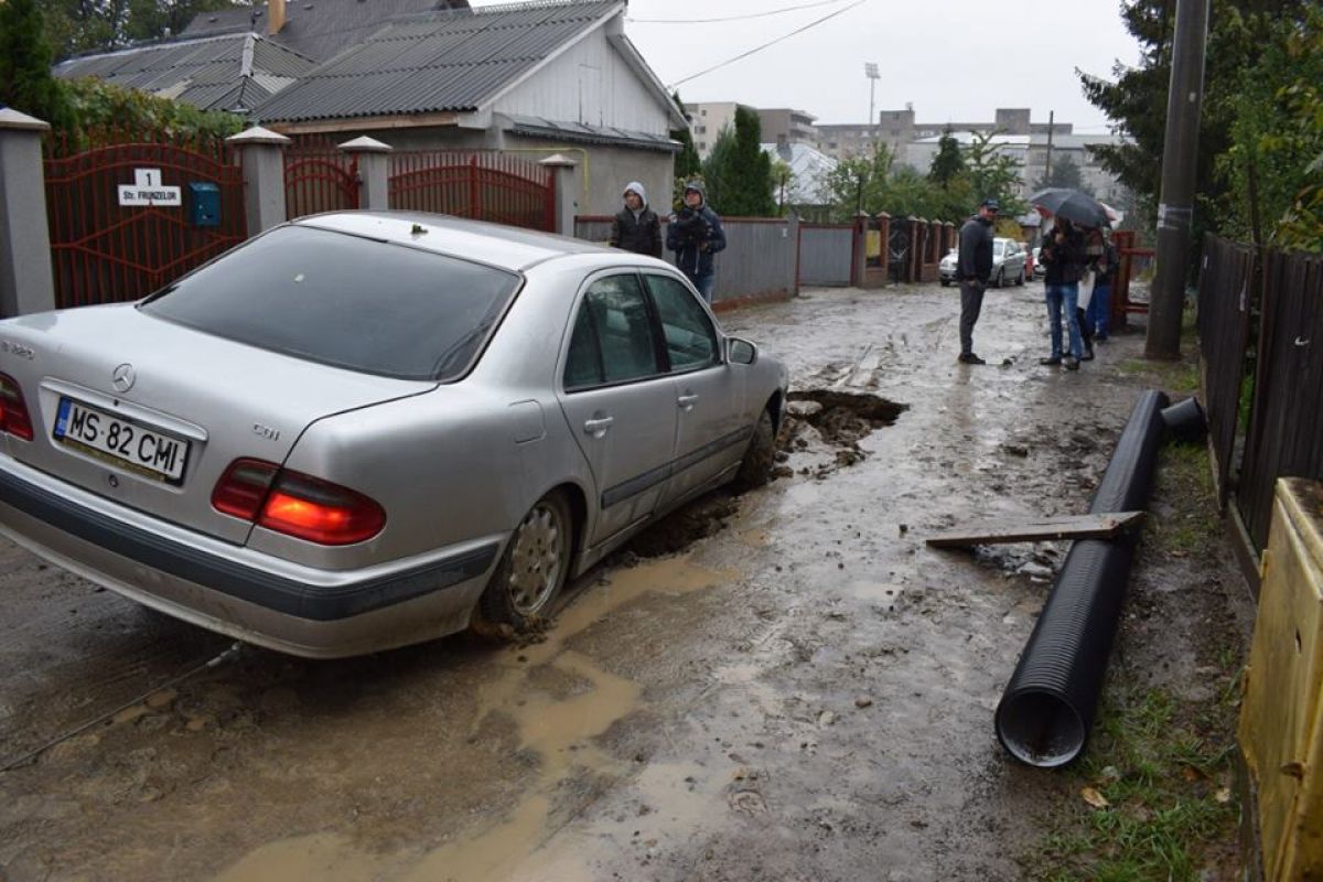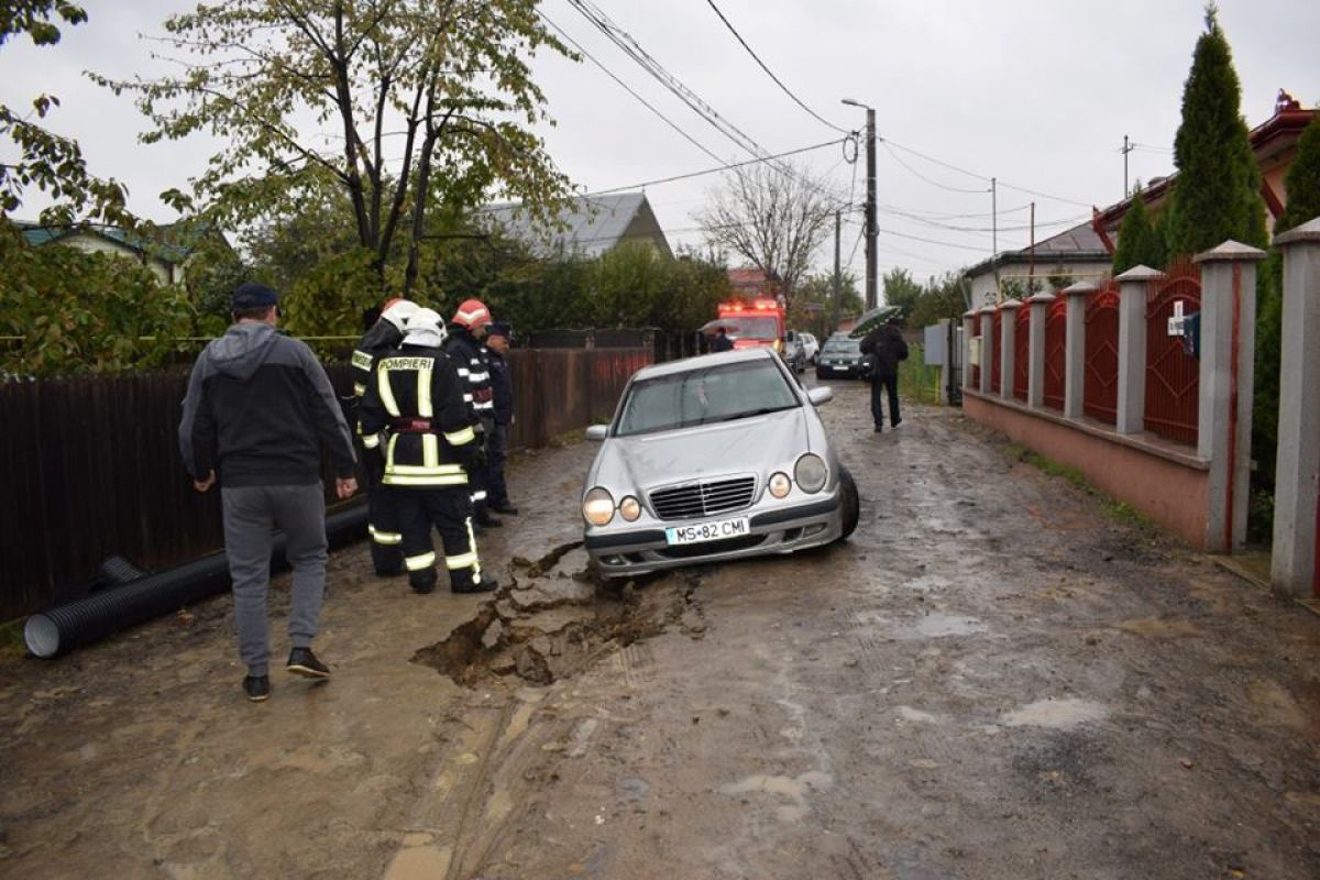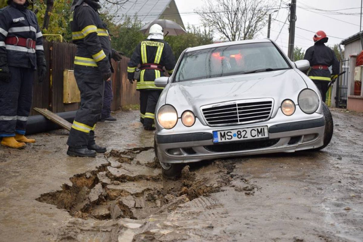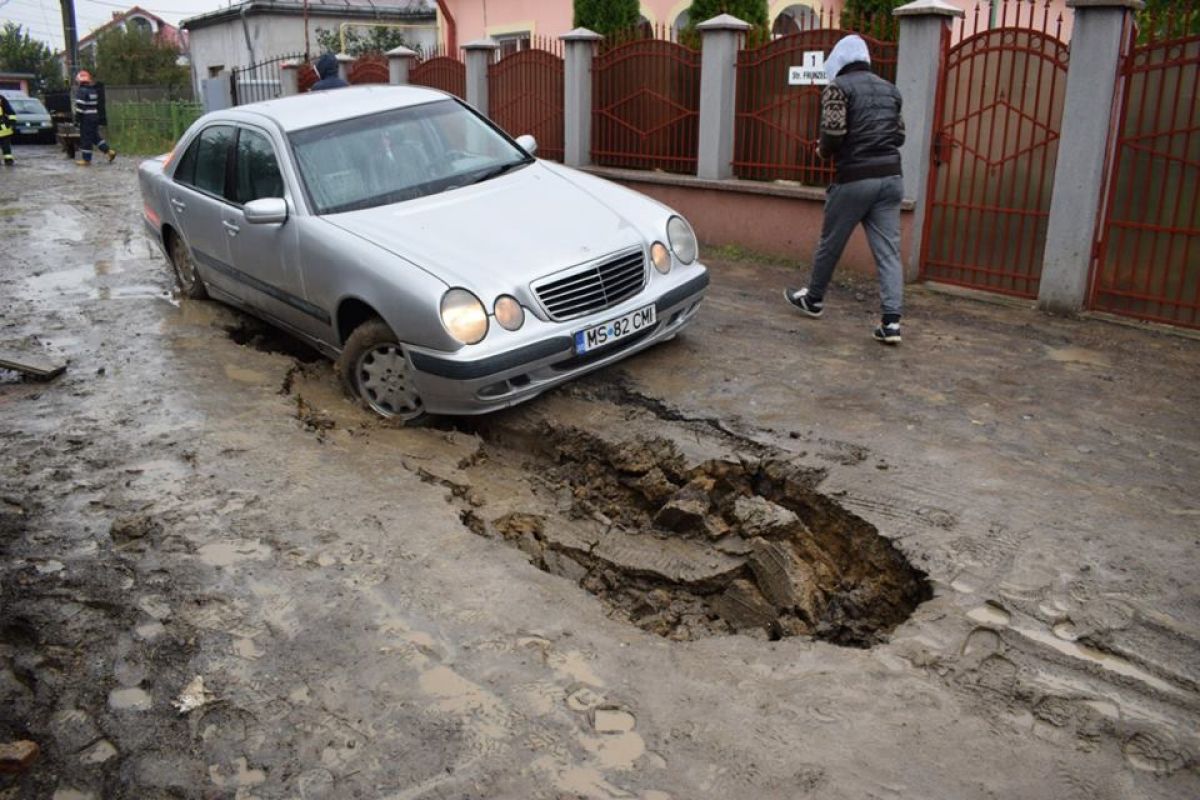 S-a întâmplat în urmă cu câteva zeci de minute pe strada Frunzelor din municipiu. Un autoturism marca Mercedes a rămas blocat după ce drumul pe care circula s-a prăbușit efectiv și pe o bucată de aproximativ un metru s-a căscat un crater adânc.