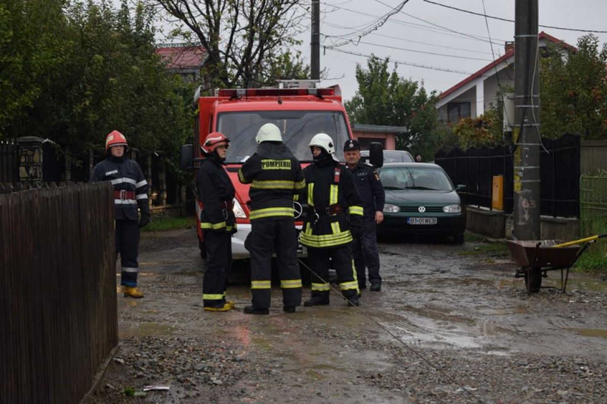 Au venit pentru a-i scoate autoturismul din groapa care s-a format în drum echipaje ale Detașamentului de pompieri Botoșani.
