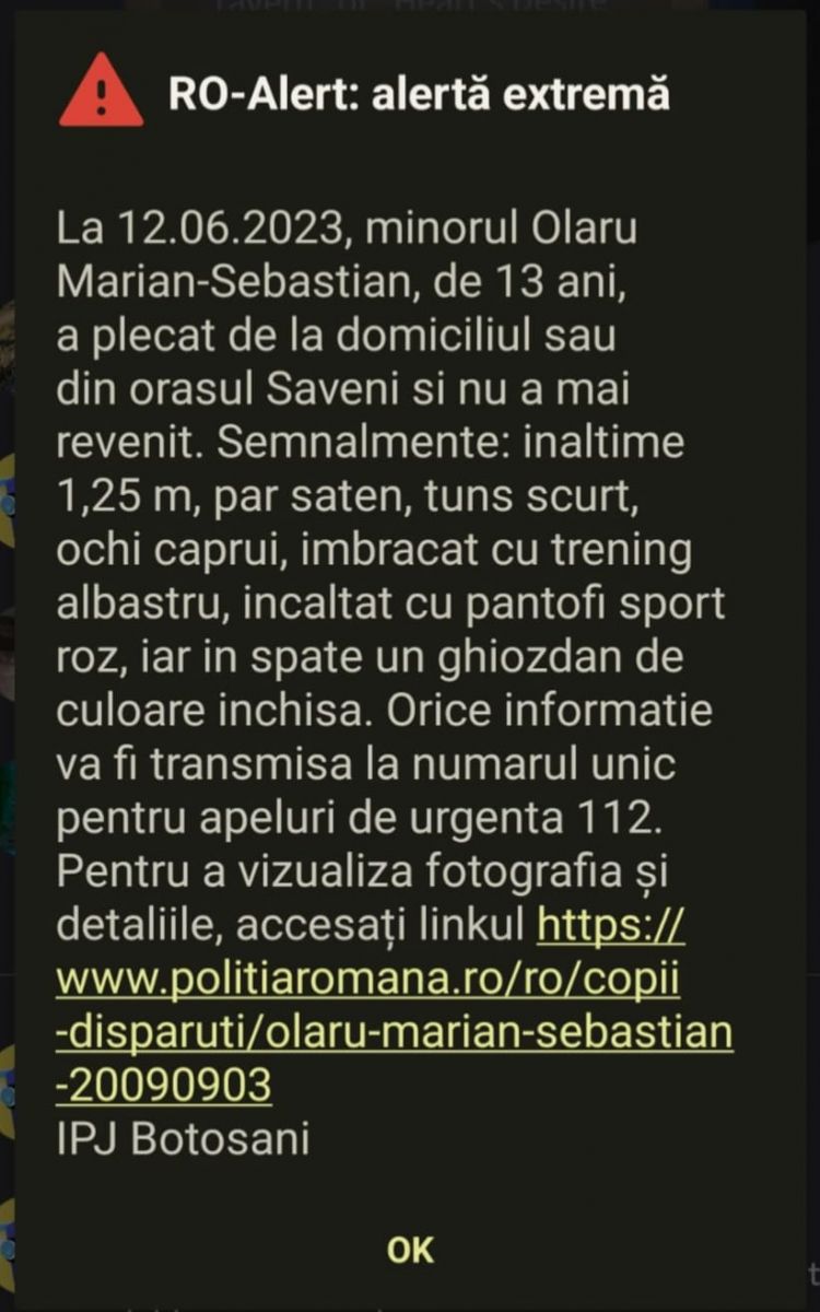 A fost transmis mesajul RO-ALERT- dispariție copil locuitorilor din Săveni, Avrămeni, Drăgușeni și Ungureni
