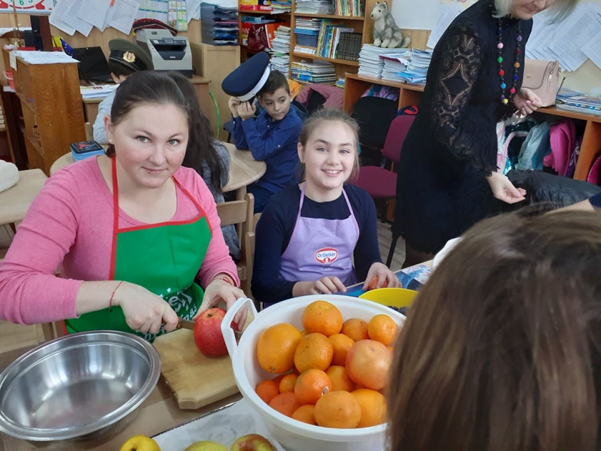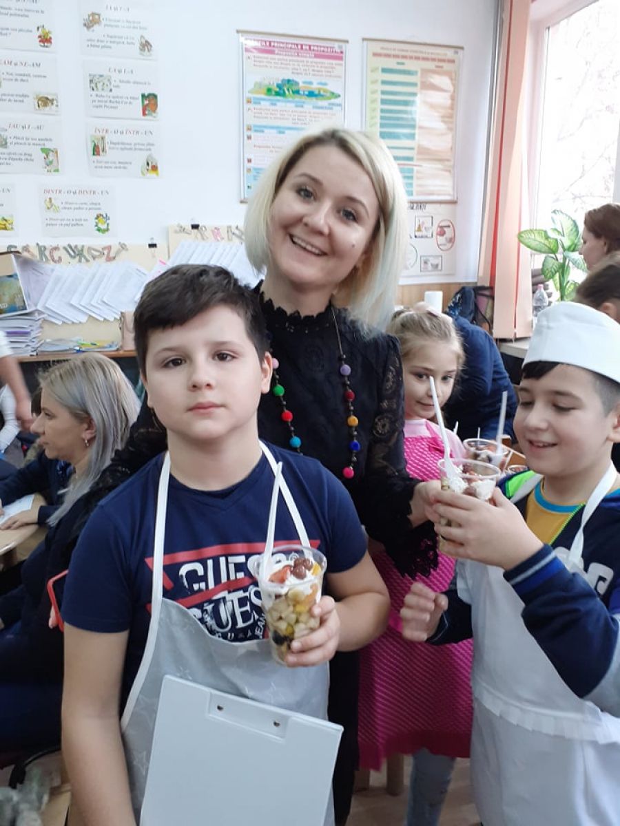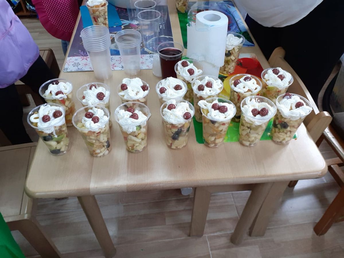 Cofetarii au preparat o delicioasă salată de fructe, ornată cu frișcă,ce a fost servită tuturor.