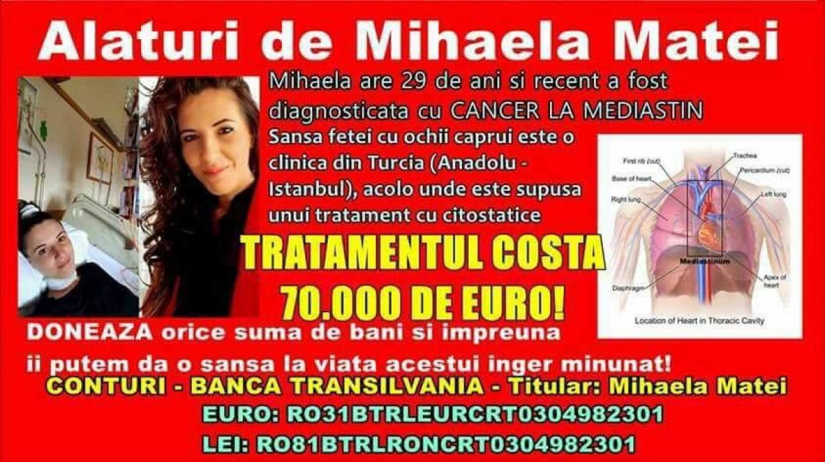 Ei bine, conexiunea a fost făcută de consilierul local Andreea Buiuc, prin fratele ei Andrei, iar organizatorii acțiunii au acceptat ca toate fondurile colectate pe 29 noiembrie să fie donate Mihaelei Matei, fata de 29 de ani cu limfom malign nonHodgking difuz cu celula mare B. Medicii turci la care se tratează au estimat că mai are nevoie de maxim opt cure de citostatice, însă costul acestora se ridică la 52.000 de euro, plus cheltuielile cu deplasarea și cazarea, astfel încât suma totală necesară atinge 70.000 de euro.
