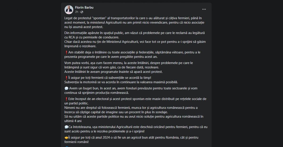 „Nimeni nu are dreptul să folosească fermierii, munca lor și agricultura românească pentru a încerca să câștige capital de imagine sau un procent în plus în sondaje. Să nu uităm că aceste partide politice nu au avut nicio soluție pentru agricultura românească în ultimii 4 ani”,