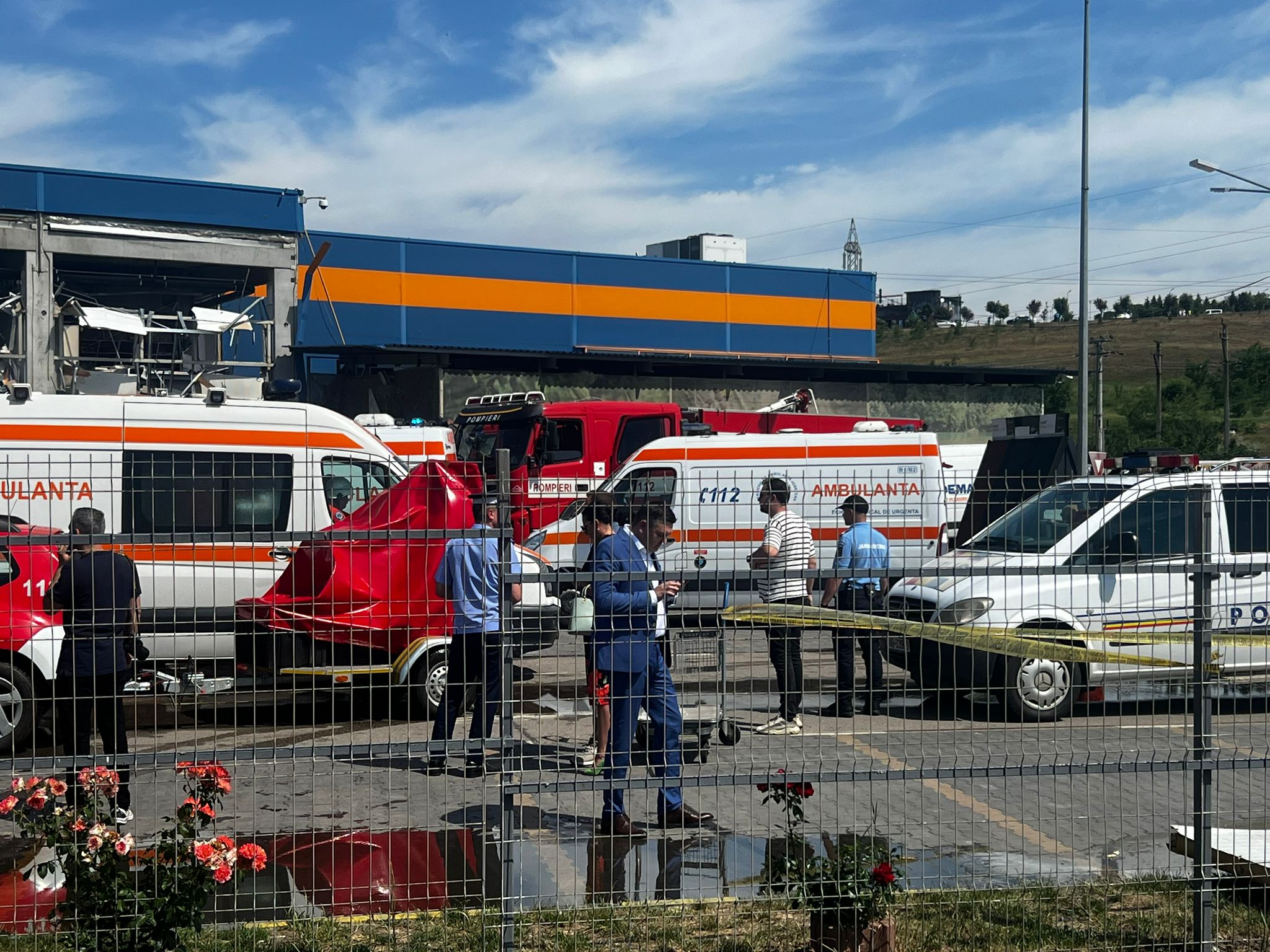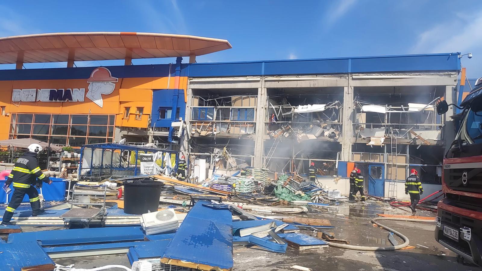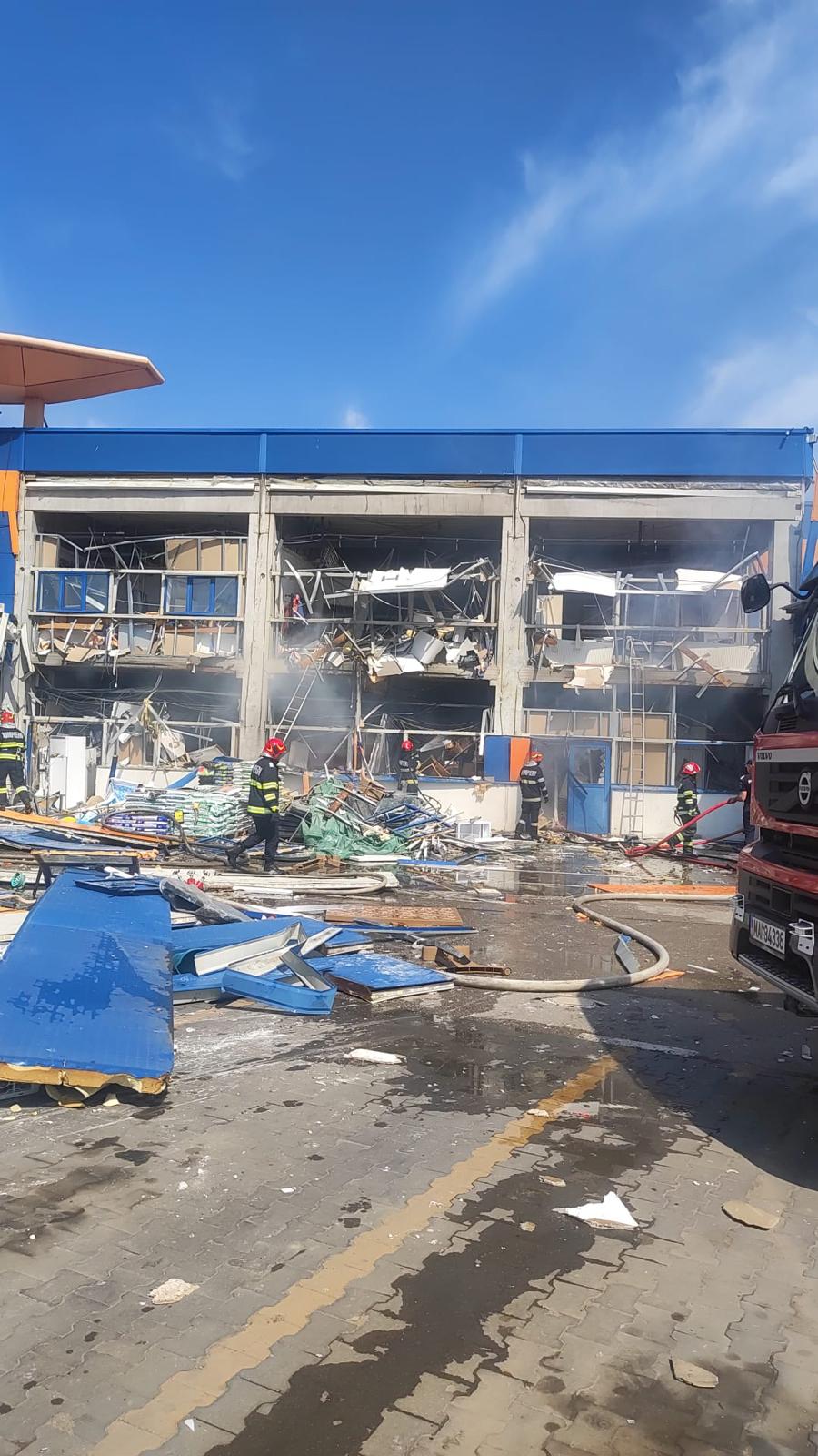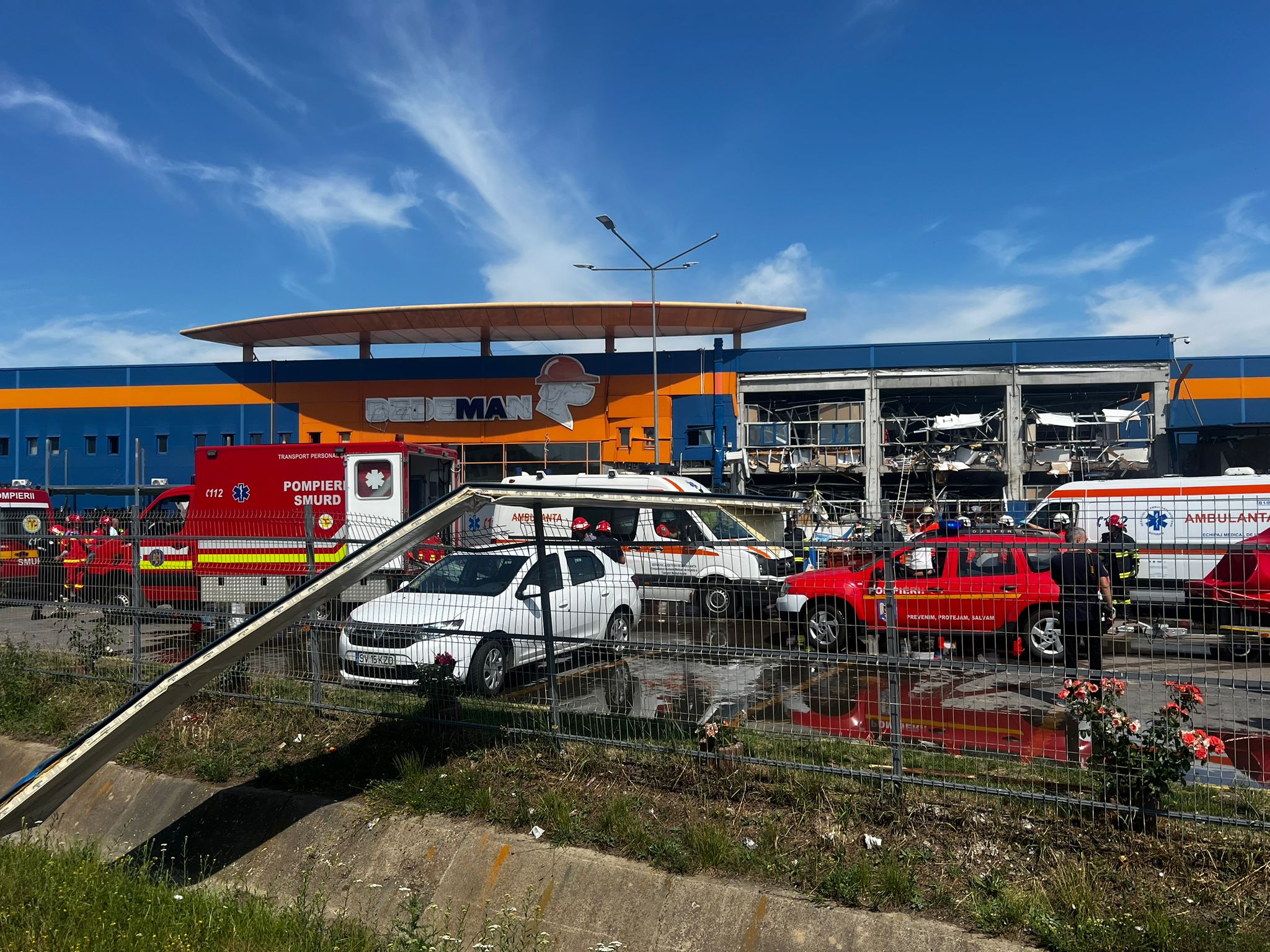 La acest moment, în parcarea complexului Dedeman încă se încearcă limitarea dezastrului produs de explozia care a avut loc în această dimineață.