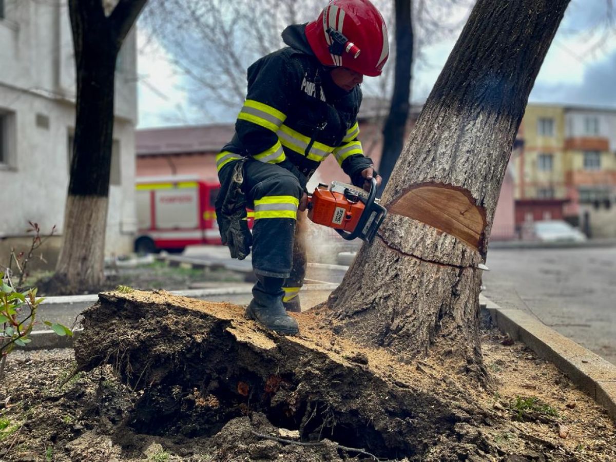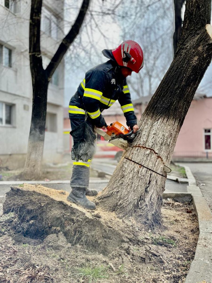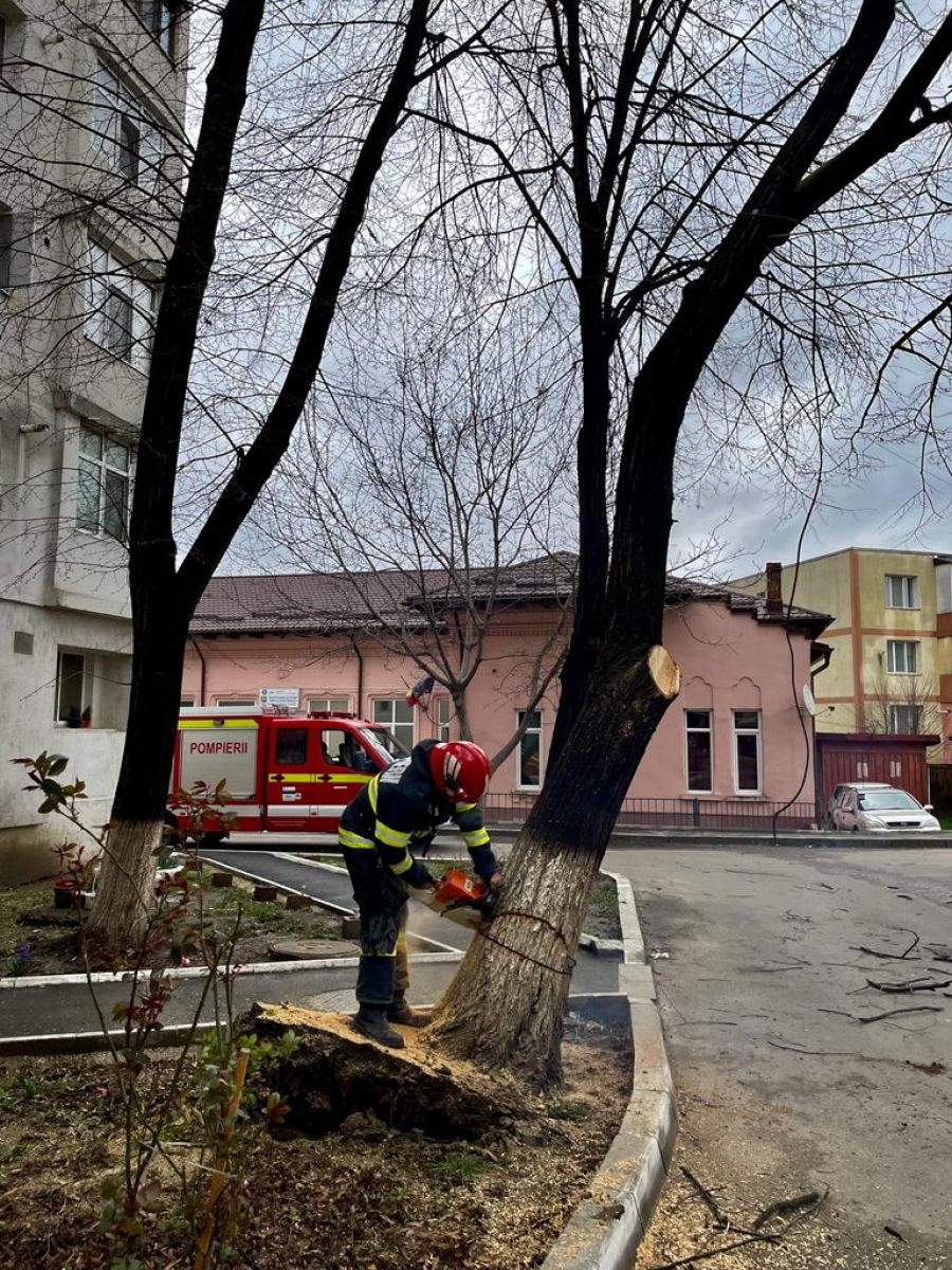 Un echipaj din cadrul Detașamentului de Pompieri Botoșani a intervenit cu o autospecială de stingere, dotată cu accesorii specifice pentru tăierea copacului, și au înlăturat pericolul.