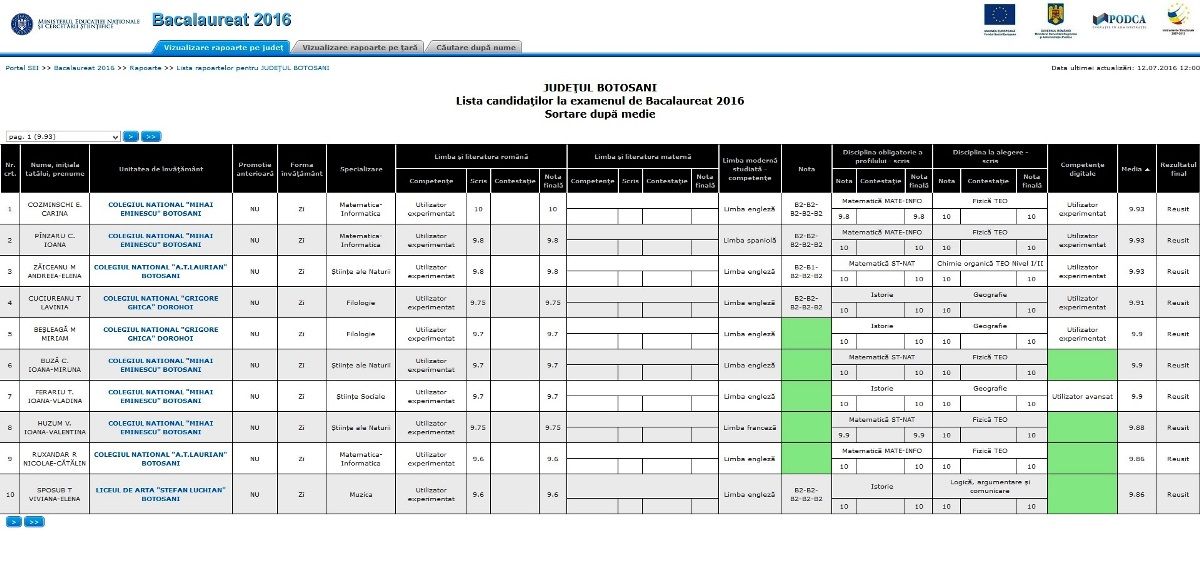 Cinci din primii 10 elevi de la ”Examenul Maturității” provin de la Colegiul Național Mihai Eminescu, câte doi de la Colegiul Național AT Laurian și Colegiul Național Grigore Ghica Dorohoi, iar unul de la Liceul de Artă Ștefan Luchian.