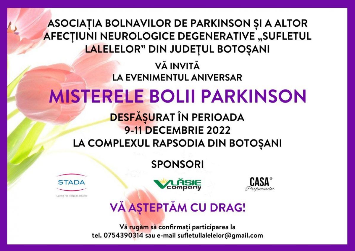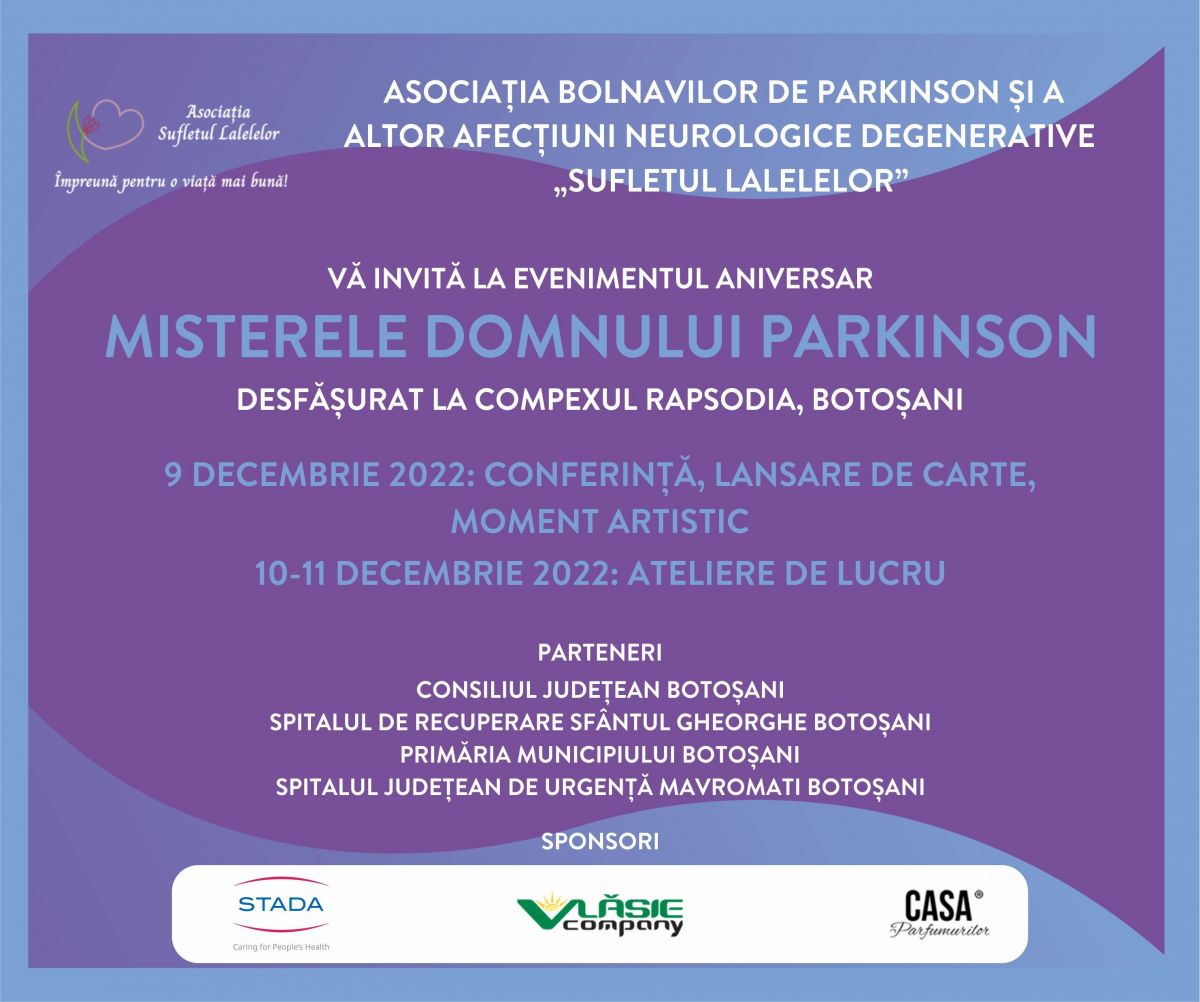 Pentru a marca frumusețea celor cinci ani petrecuți în slujba persoanelor diagnosticate cu boala Parkinson, Alzheimer, demență, scleroză multiplă, Asociația va organiza evenimentul național ”Misterele Bolii Parkinson”, desfășurat între 9 și 11 decembrie 2022, la Hotelul Rapsodia din Botoșani.
