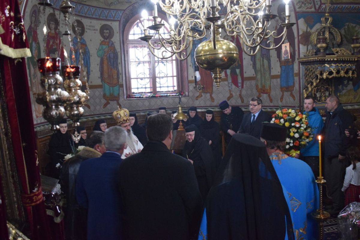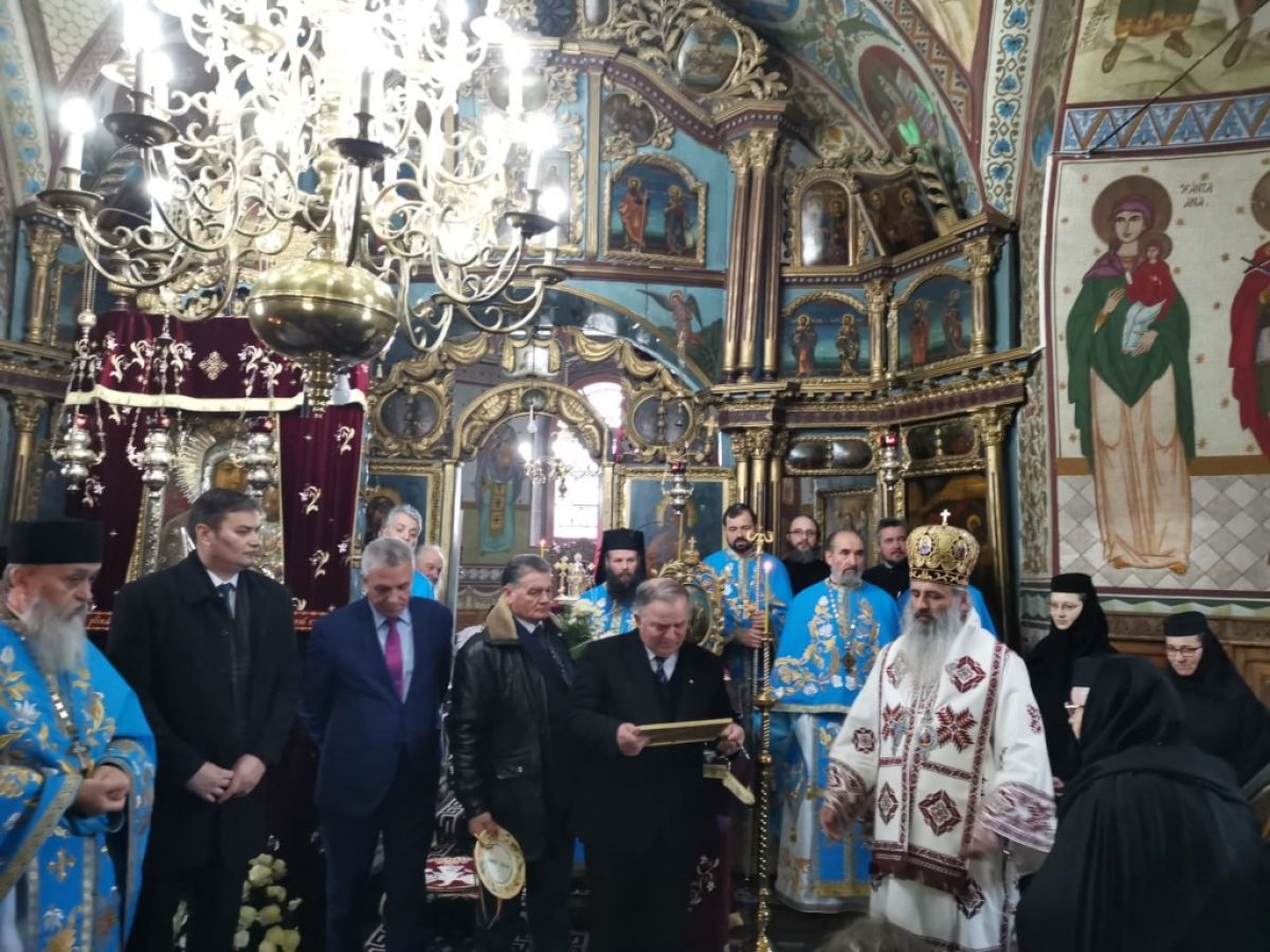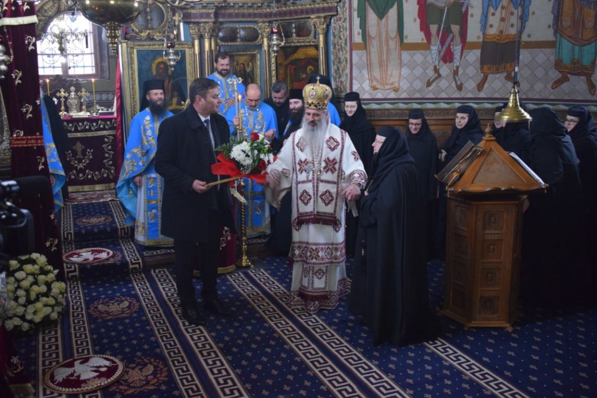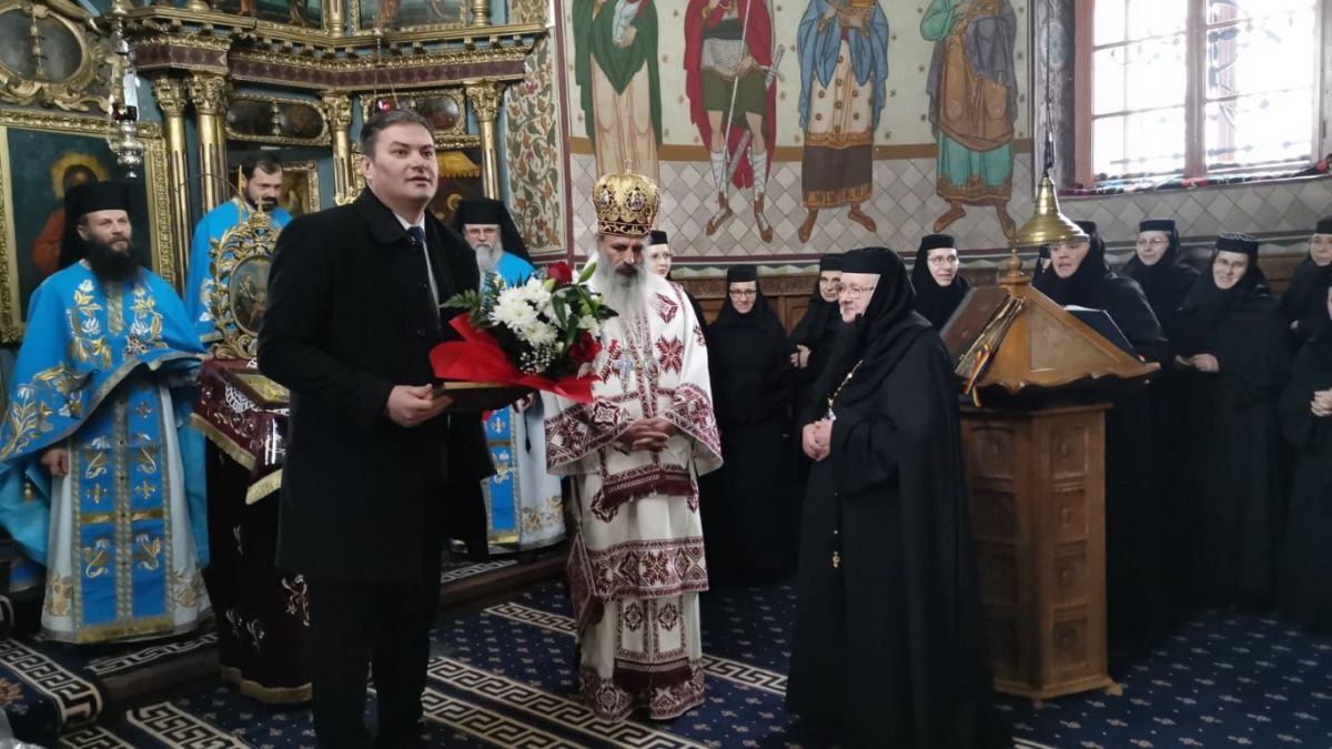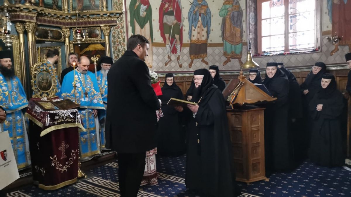 Prefectul Dan Şlincu a fost unul dintre mirenii invitaţi la slujbă, reprezentantul Guvernului dăruindu-i maicii stareţe un buchet de flori şi o diplomă aniversară.