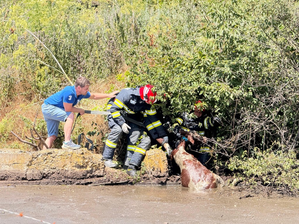 Aceștia au constatat faptul că vițelul era în fosă, în viață, și l-au adus la mal.