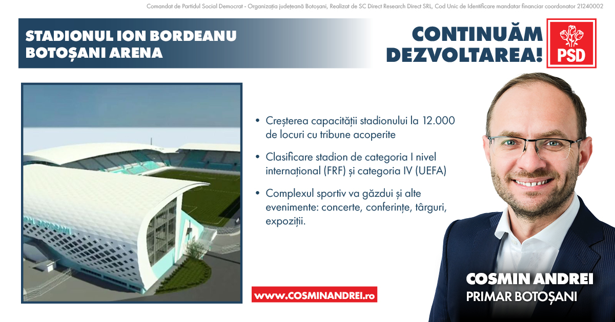 „Guvernul PSD susține realizarea acestui obiectiv de investiții din Botoșani. Sunt în legătură permanentă cu colegii mei de la București și o să vă comunic fiecare pas pe care îl vom face pentru a duce la capăt acest proiect, așa cum am făcut cu toate investițiile din acest mandat. Stadionul Ion Bordeanu îl vom aduce la nivelul unei Arene de nivel UEFA, un complex sportiv la cele mai înalte standarde. Vom crește capacitatea stadionului la 12.000 de locuri, vom avea tribune acoperite. Vom face toate modernizările pentru a obține clasificare de categoria I nivel internațional (FRF) și categoria IV (UEFA). Vor fi amenajate săli de antrenament și recuperare, birouri și spații comerciale, magazine articole sportive, restaurante, parcări subterane inclusiv pentru locuitorii din zonă. Complexul Botoșani Arena va găzdui și alte evenimente: concerte, conferințe, târguri, expoziții.”, a subliniat primarul Cosmin Andrei.