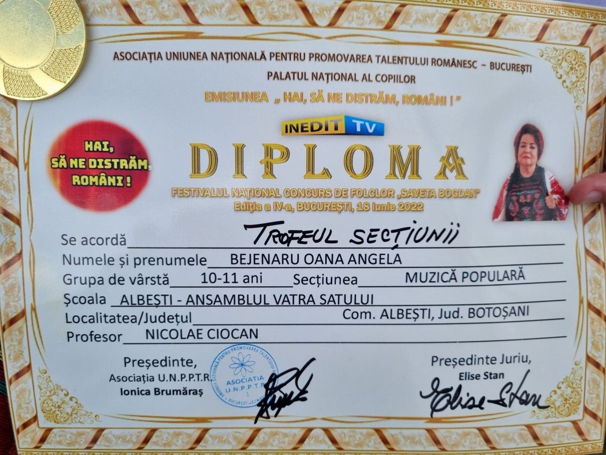 Trofeul secțiunii Muzică Populară (grupa de vârstă 10-11 ani) a fost obținut de Bejenaru Oana Angela.