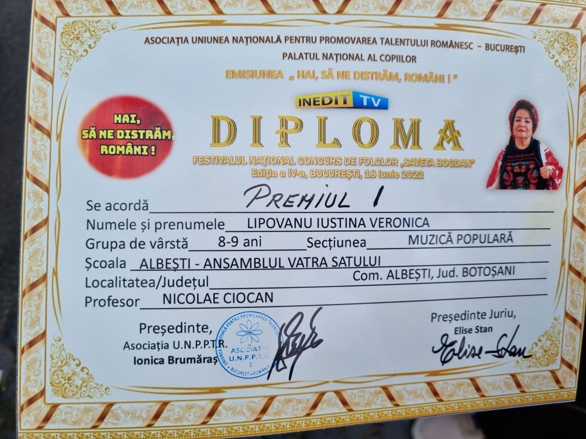 Iar Lipovanu Iustina Veronica a obținut, la grupa de vârstă 8-9 ani, Premiul I la secțiunea Muzică Populară.
