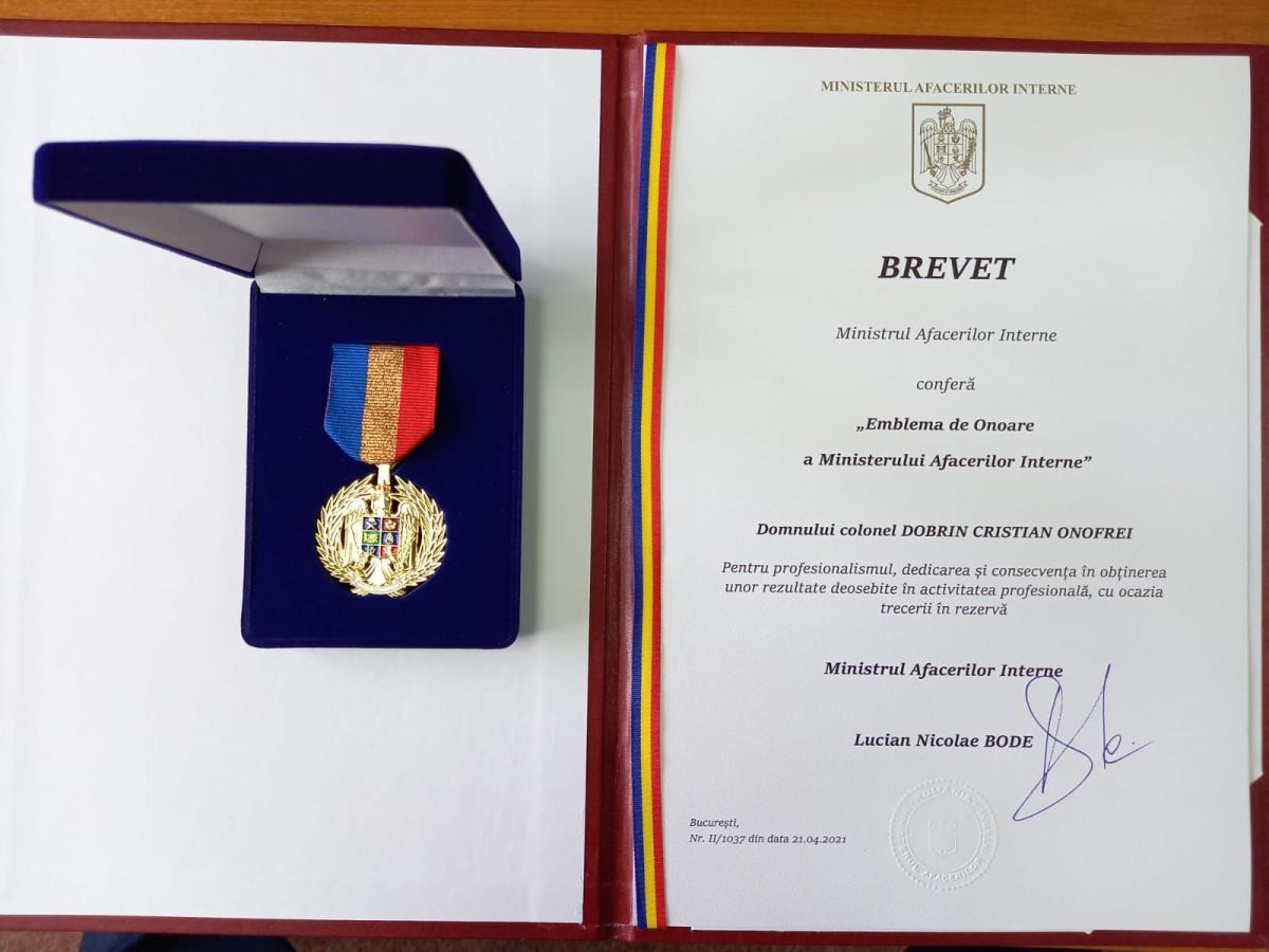 Vineri după-amiază, în cadrul unei activități desfășurate la sediul Instituției Prefectului, colonelul în rezervă Onofrei Dobrin-Cristian a fost recompensat de către Lucian Bode, ministrul afacerilor interne, cu Emblema de onoare a Ministerului Afacerilor Interne.