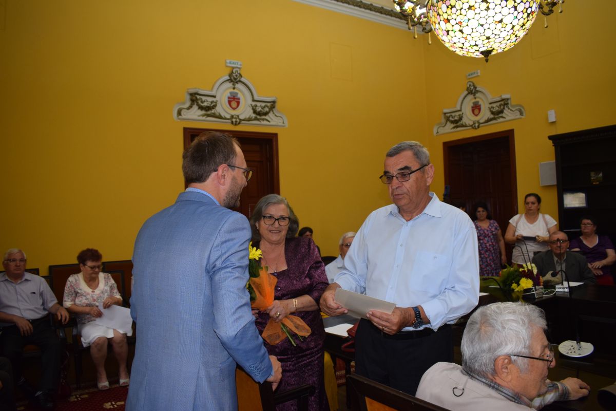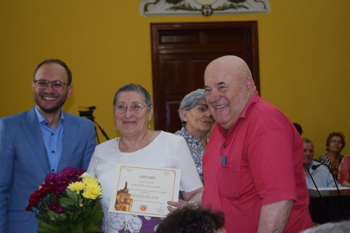 Primarul Cosmin Andrei le-a oferit diplome, flori și câte o sumă de bani, 500 de lei pentru cuplurile de aur cu 50 de ani de căsnicie și 1.000 de lei pentru cele de diamant cu șase decenii de conviețuire.