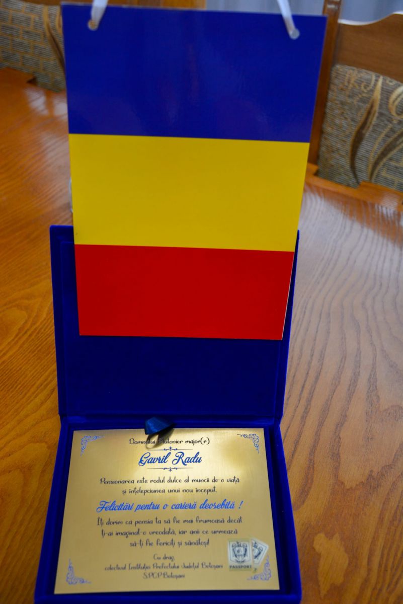 Cu ocazia ieșirii la pensie a dlui plutonier major (r) Radu Gavril, prefectul județului Botoșani, Sorin Cornilă și Alin Popovici, șeful Serviciului Public Comunitar de Pașapoarte Botoșani, i-au acordat o diplomă de merit și o plachetă aniversară cu ocazia pensionării.