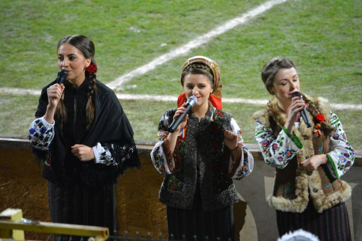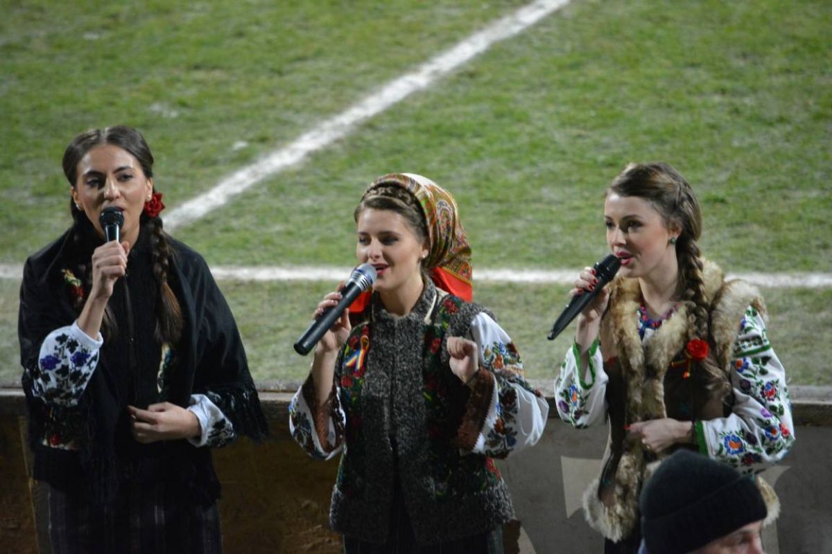 Artistele nu au intrat pe gazon, ci au rămas undeva în fața tunelului de unde au cântat spre public. Din tribune majoritatea suporterilor filmau momentul cu telefoanele mobile sau își făceau selfie.
