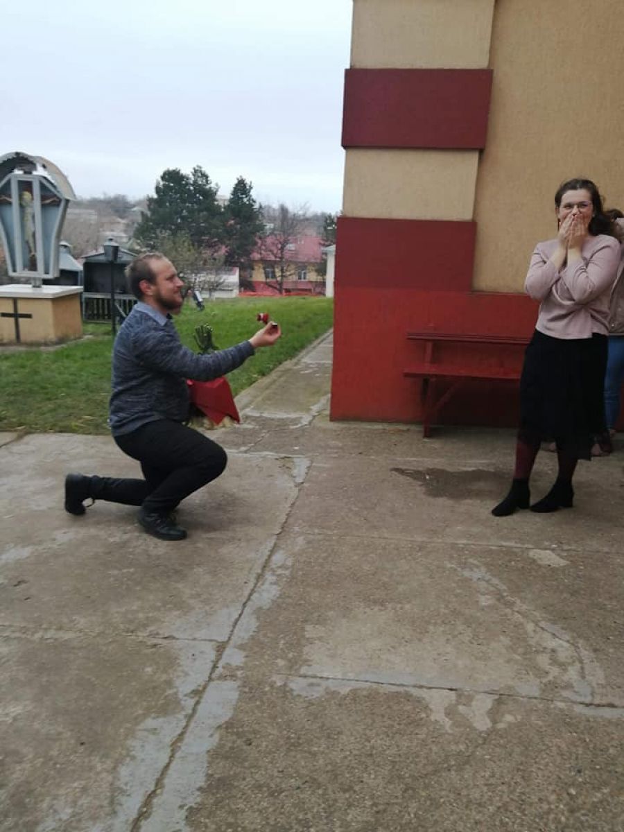 Emoția a persistat până la Biserica din Călărași unde a ajuns întreg grupul și pe treptele căreia, George cu un buchet de flori într-o mână și inelul în cealaltă, a îngenuncheat cavalerește și a rostit întrebarea.