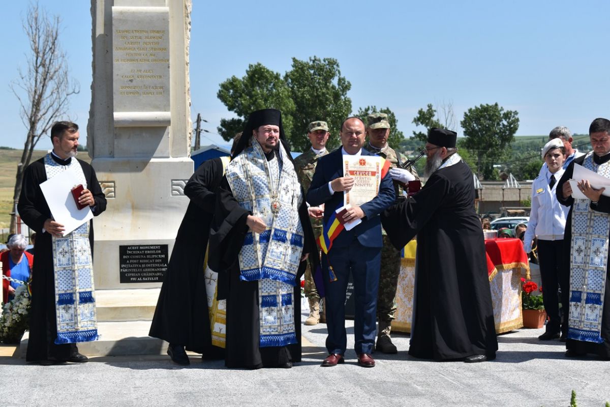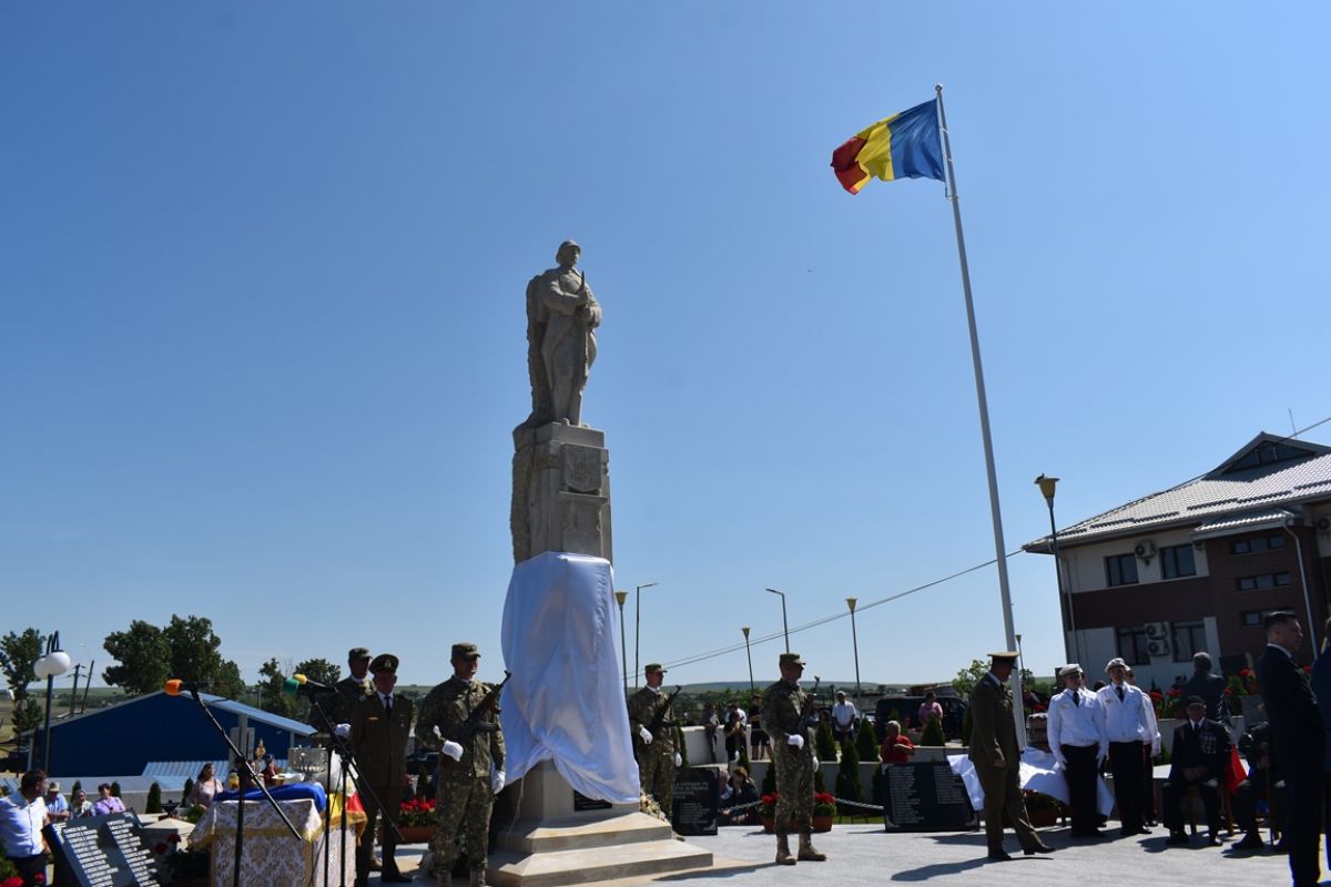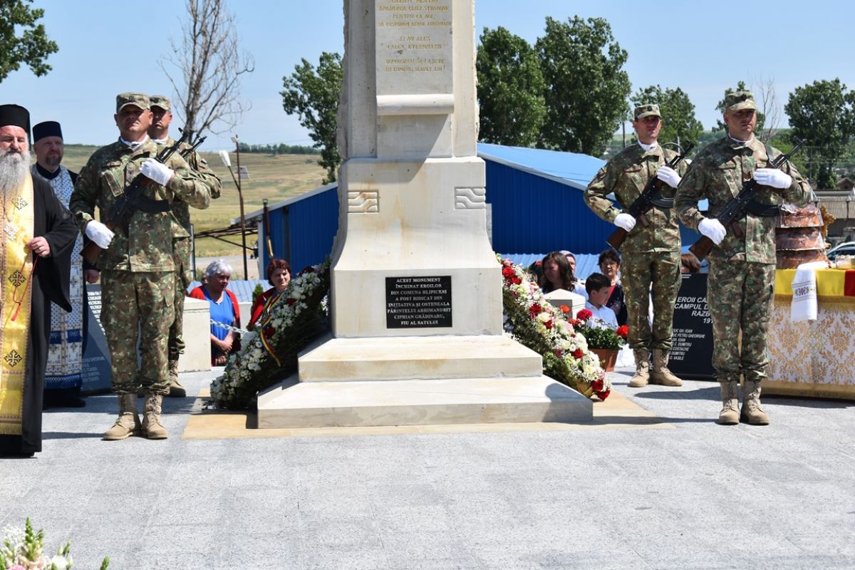 După ce a avut o contribuție decisivă la restaurarea Bisericii Sfântul Nicolae din centrul comunei, peste drum, părintele arhimandrit Ciprian Grădinaru, fiu al satului și cetățean de onoare, a inițiat construcția unui ansamblu care, pe lângă monumentul propriu-zis realizat de sculptorul Ion Lozan din Soroca, Republica Moldova, include un avion Delfin L 29, simbol al Forțelor Aeriene Române și un obuzier cu calibrul de 122 disponibilizat de Armata Română.