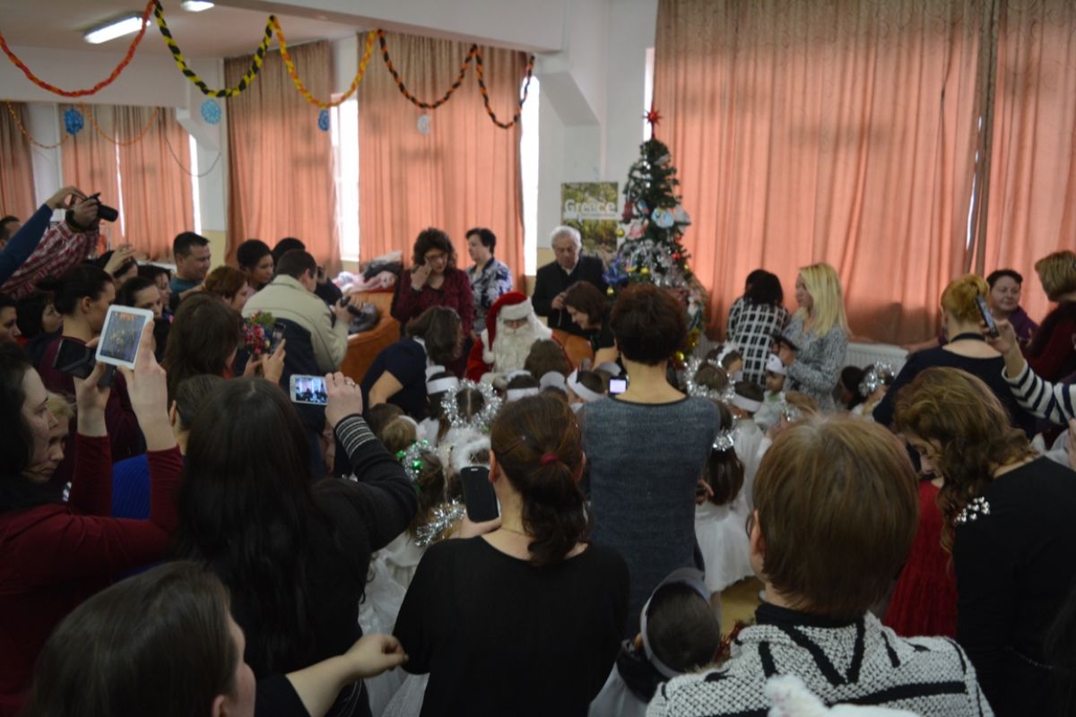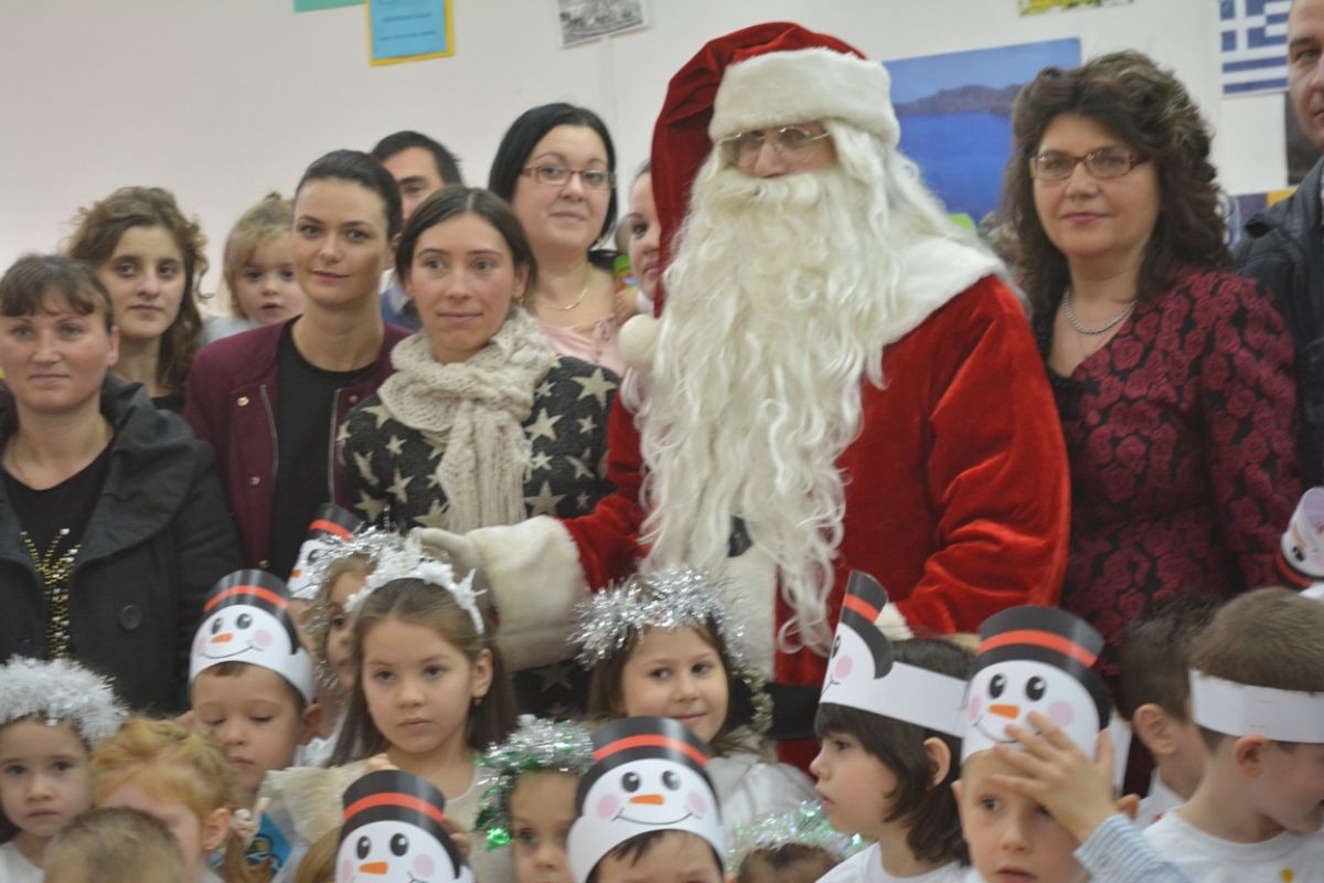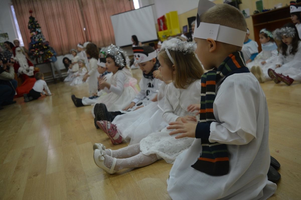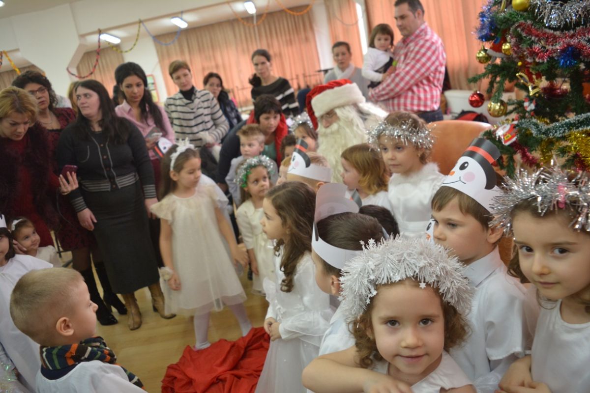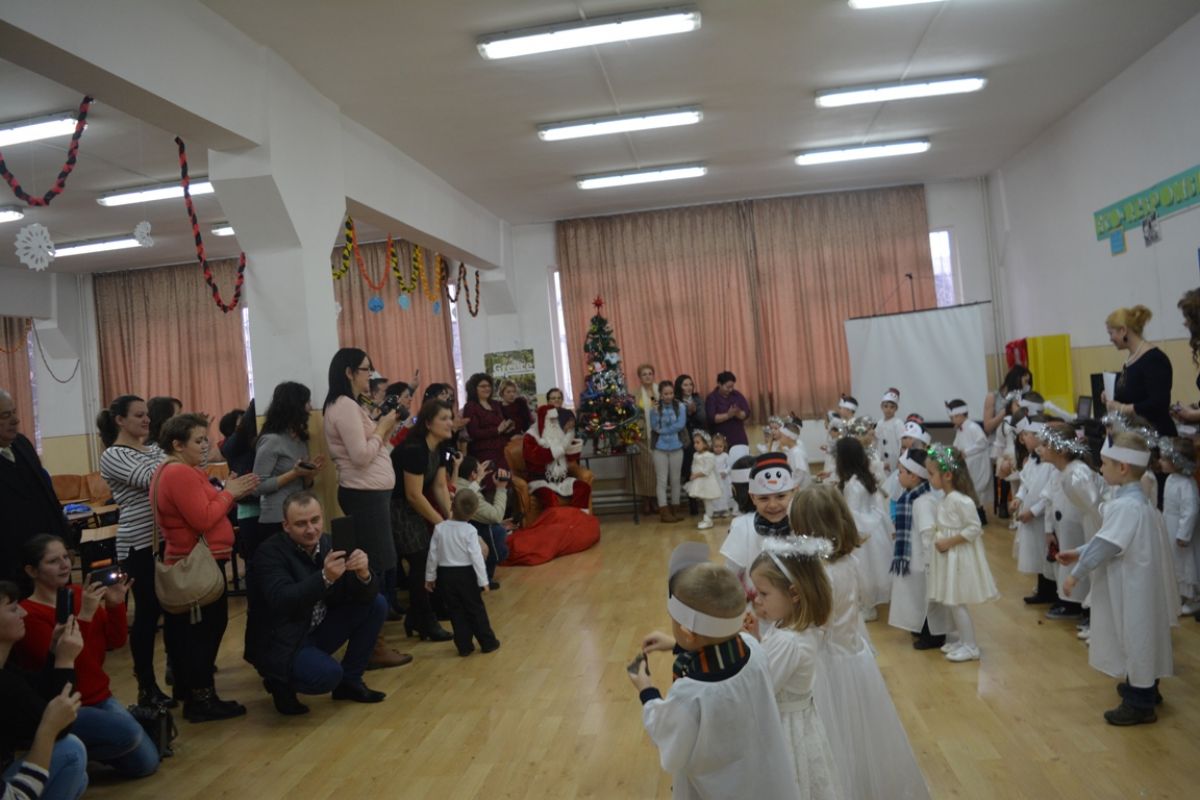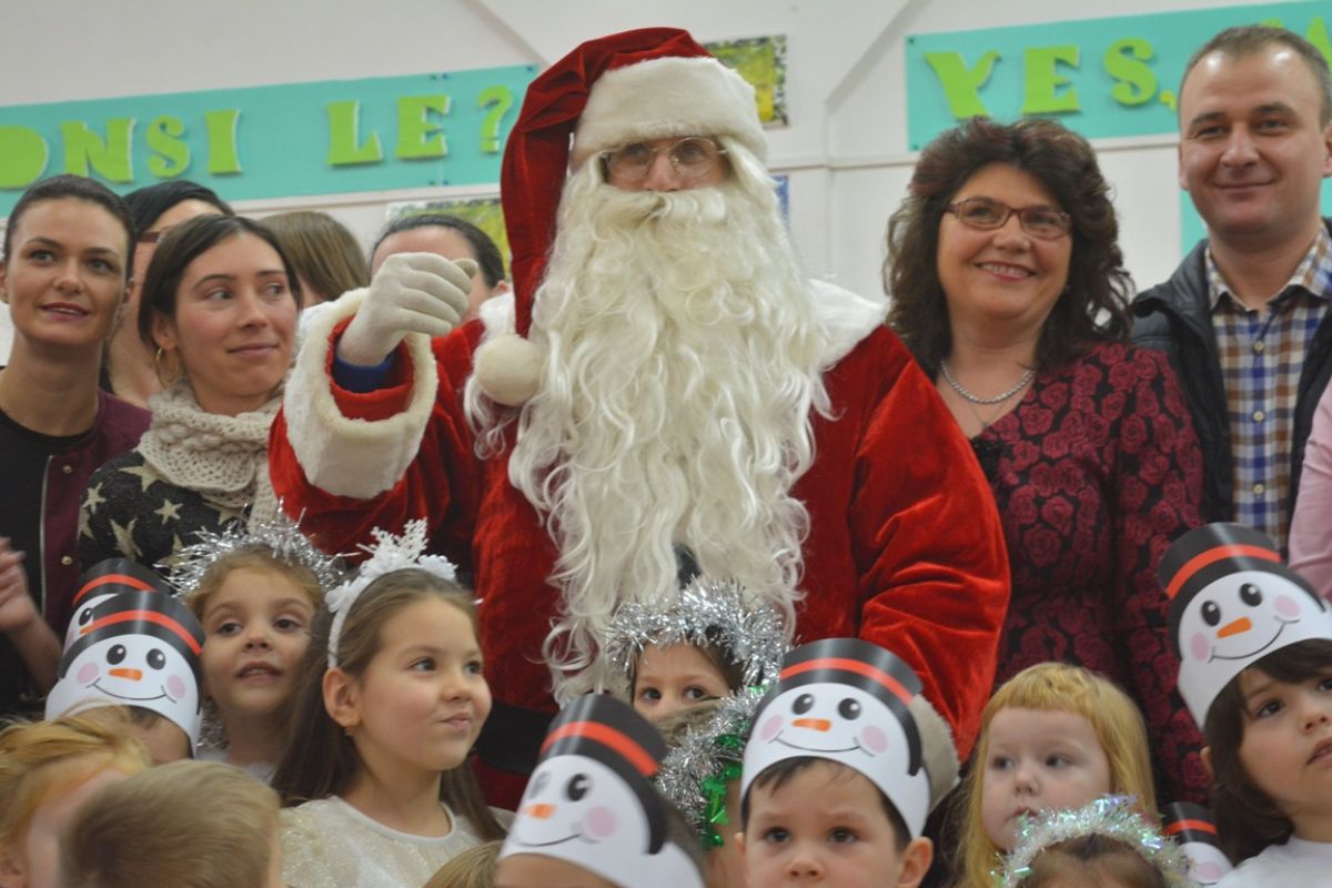 Iar micuţii l-au întâmpinat cum se cuvine. Costumaţi de sărbătoare, cu coifuri şi coroniţe pe căpşoare, au dat un spectacol care l-a făcut pe cel mai bun moş din lume să-i aplaude în mai multe rânduri, în timp ce unii părinţi, care au îngenuncheat în faţa lor pentru a-i poza şi filma, nu şi-au putut stăpâni lăcrimile. Copilaşii au cântat în mai multe limbi, au dansat, iar la final au colindat, au urat şi au sorcovit.