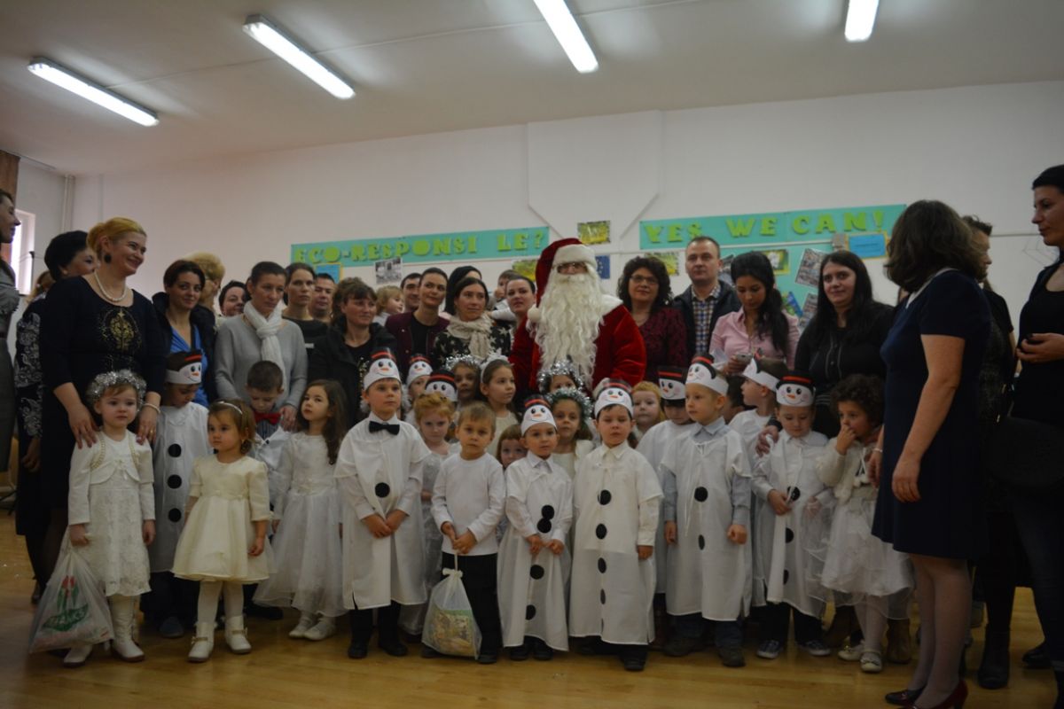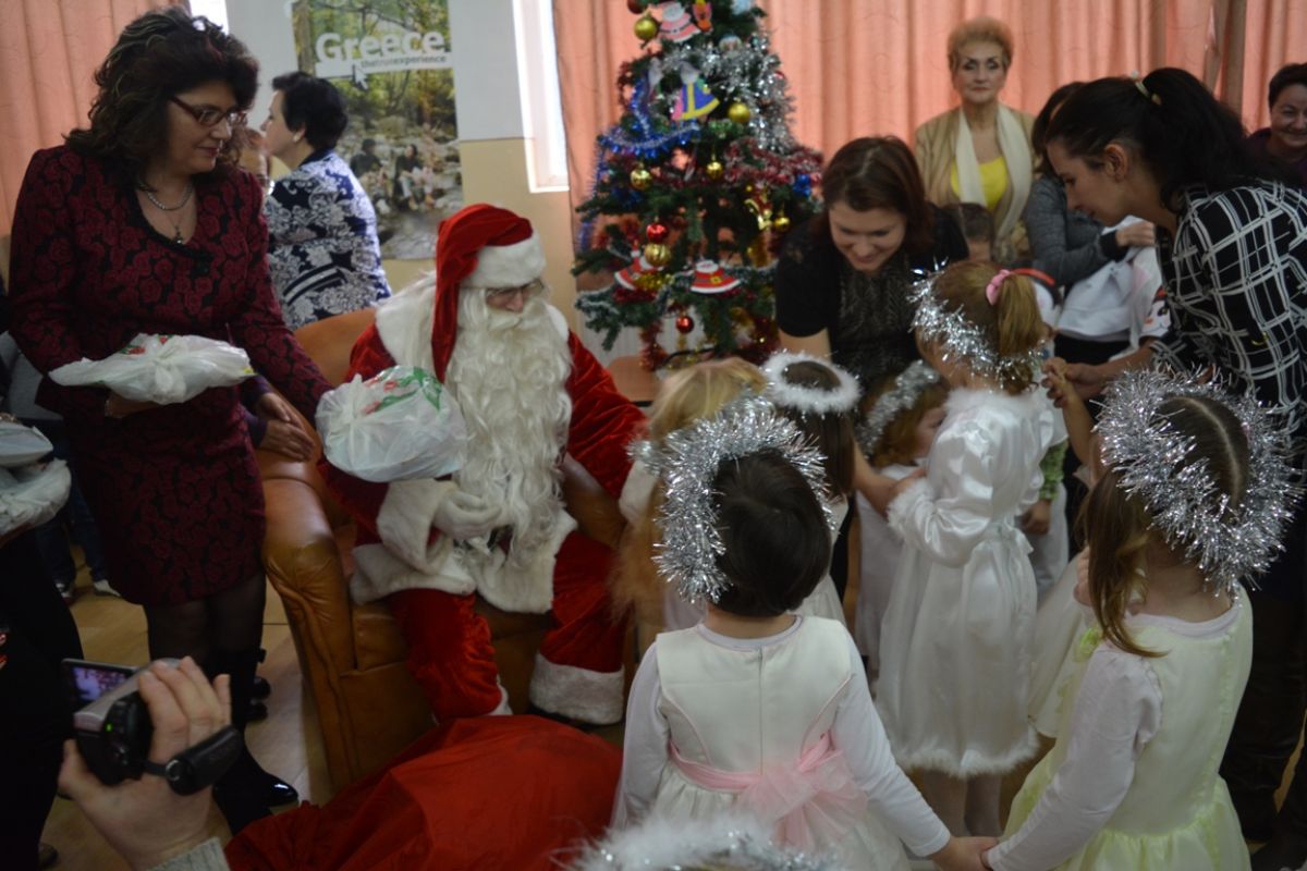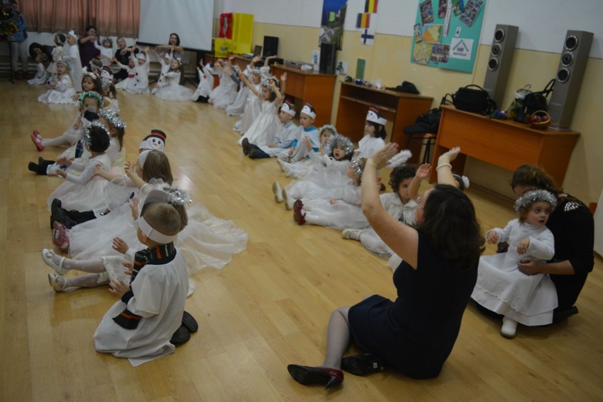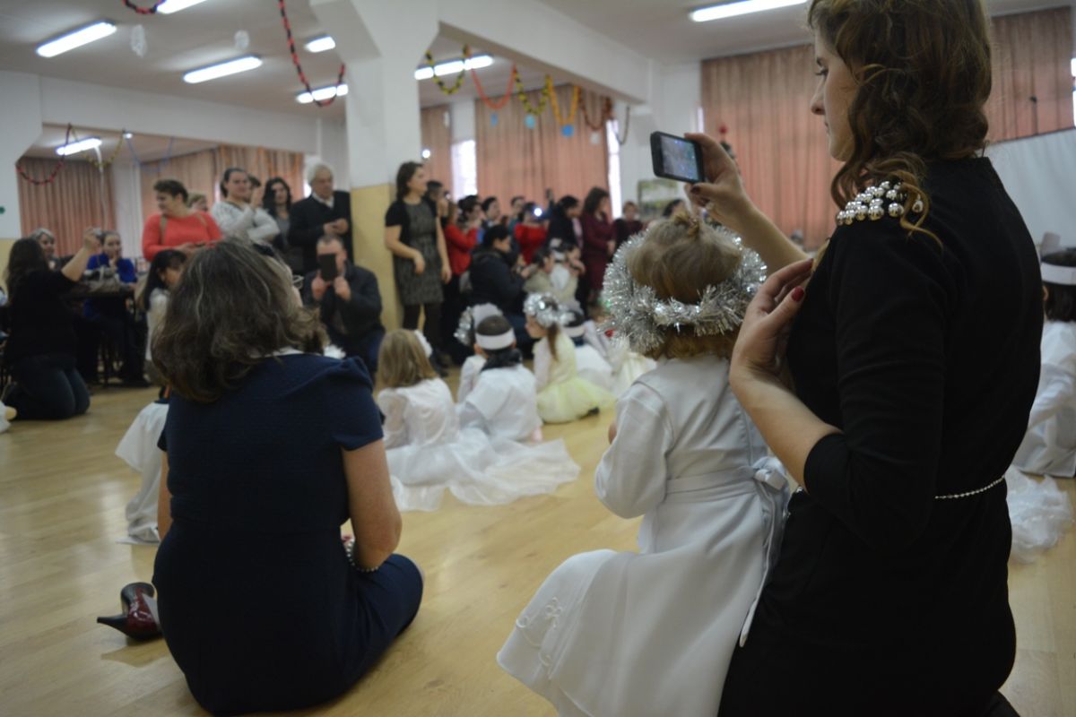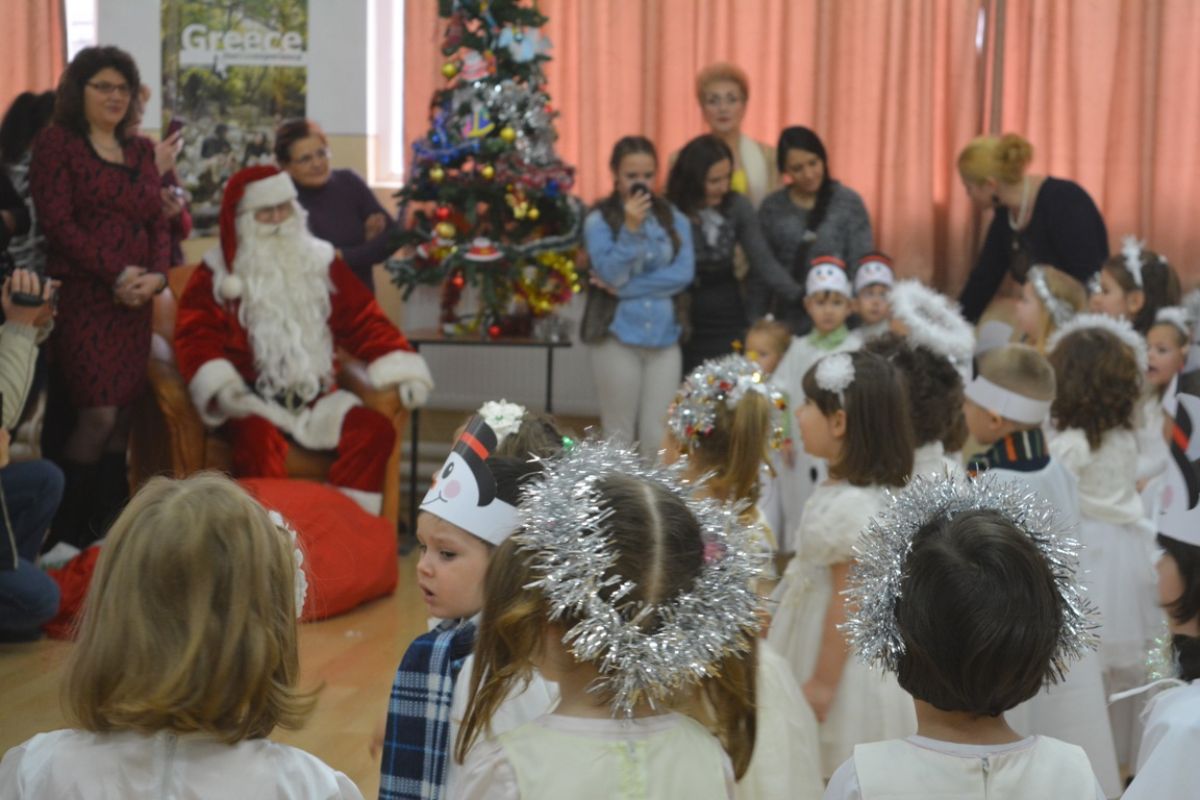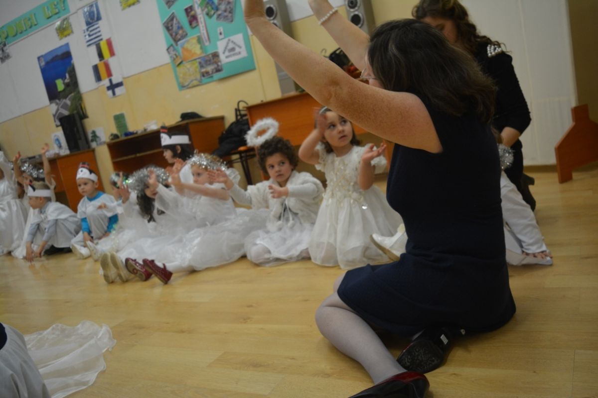 Iar micuţii l-au întâmpinat cum se cuvine. Costumaţi de sărbătoare, cu coifuri şi coroniţe pe căpşoare, au dat un spectacol care l-a făcut pe cel mai bun moş din lume să-i aplaude în mai multe rânduri, în timp ce unii părinţi, care au îngenuncheat în faţa lor pentru a-i poza şi filma, nu şi-au putut stăpâni lăcrimile. Copilaşii au cântat în mai multe limbi, au dansat, iar la final au colindat, au urat şi au sorcovit.