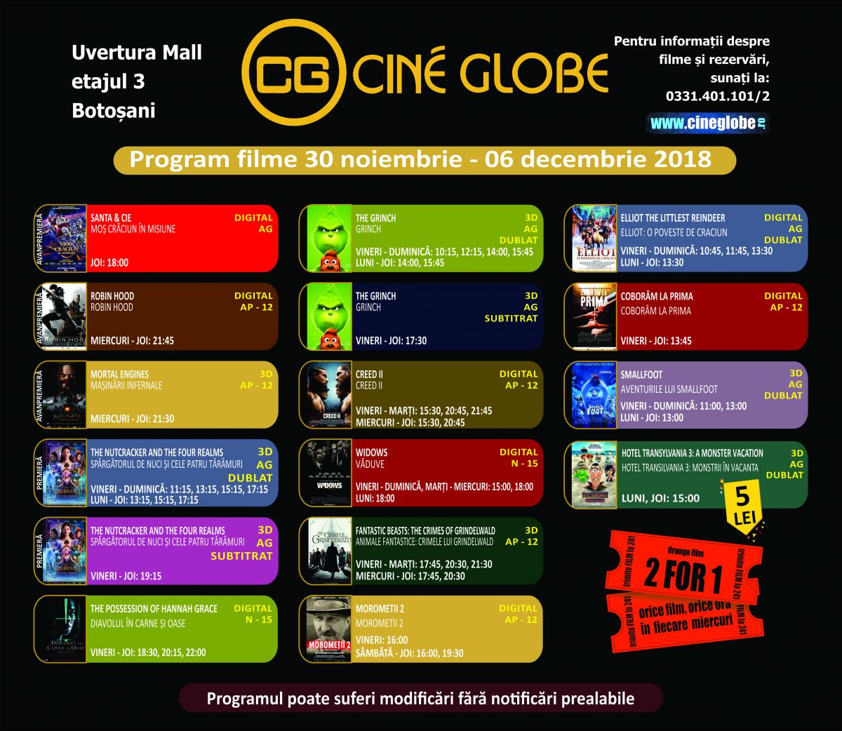 Vezi mai jos Programul complet al filmelor care rulează la Cine Globe