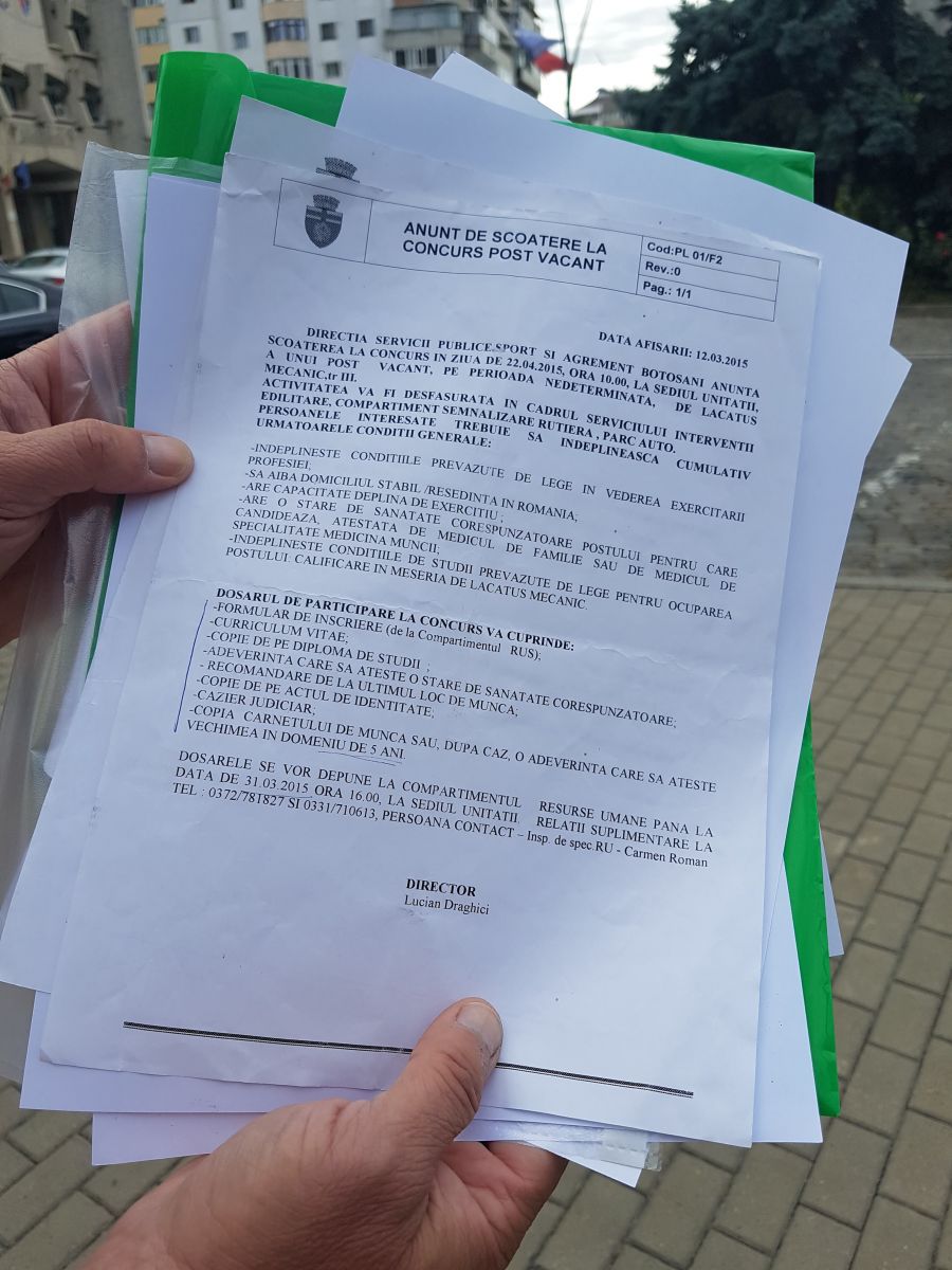 Stelu Iacobiță este lăcătuș mecanic din 2015 și susține că la concursul la care a participat și pe care l-a și promovat, postul său ar fi trebuit să fie la serviciul intervenții edilitare, compartiment semnalizare rutieră, parc auto din cadrul DSPSA.