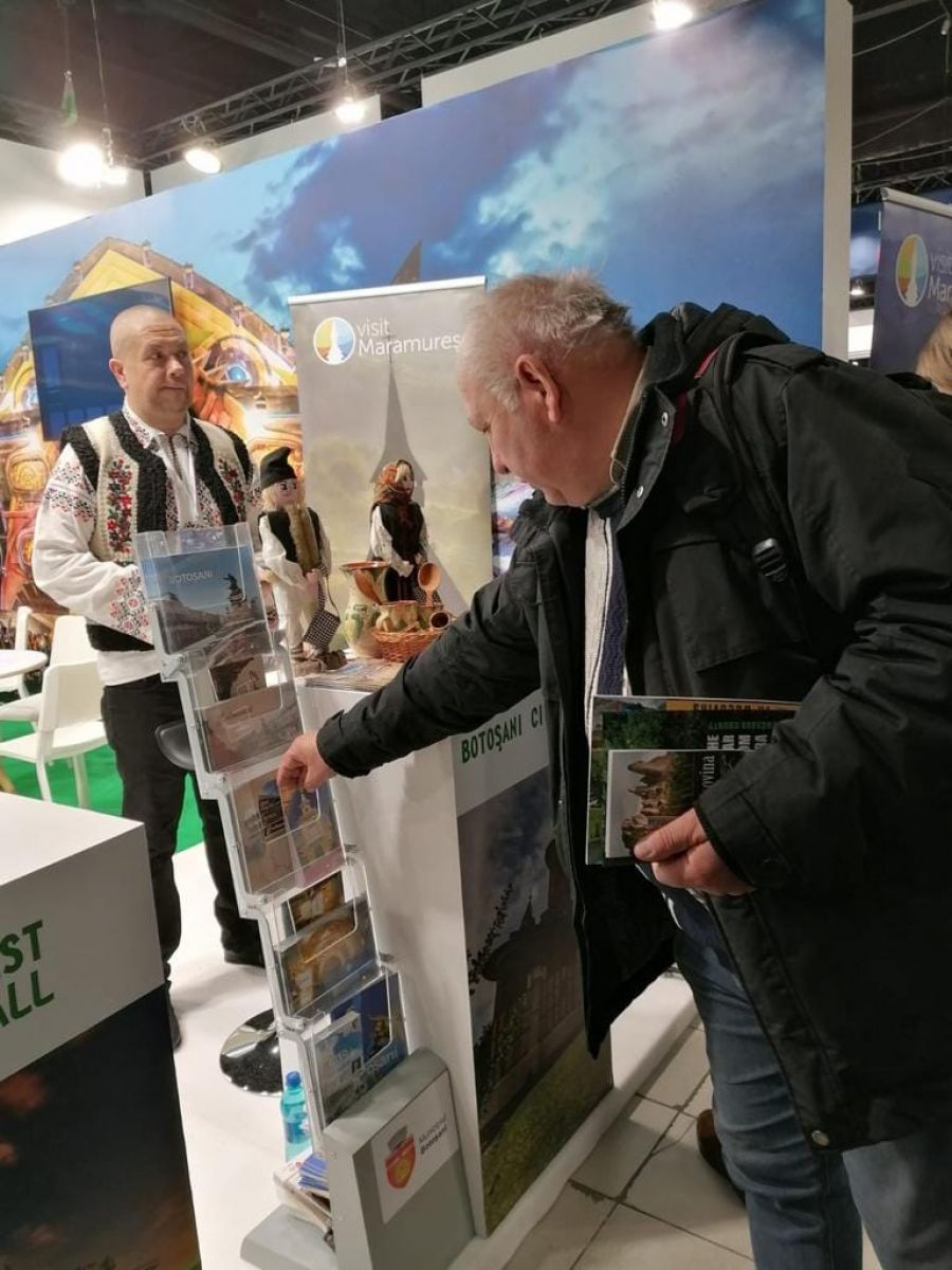Potențialii turiști polonezi atrași de standul municipiului Botoşani primesc informații și diferite obiecte promoționale, materiale de prezentare, broșuri de la colegii din cadrul Centrului Național de Informare și Promovare Turistică (CNIPT).